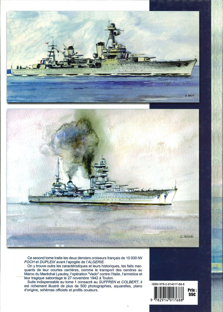 Ce second tome traite des deux derniers croiseurs français de 10 000 tW FOCH et DUPLEIX avant l'apogée de l'ALGÉRIE. On y trouve outre leurs caractéristiques et leurs historiques, les faits marquants de leurs courtes carrières, comme le transfert des cendres du Maréchal Lyautey, l'opération "Vado" contre l'Italie, l'armistice et leur tragique sabordage le 27 novembre 1942.