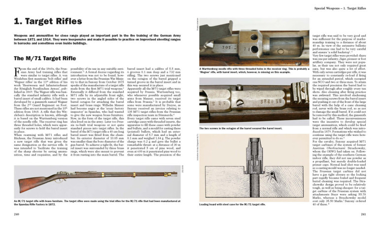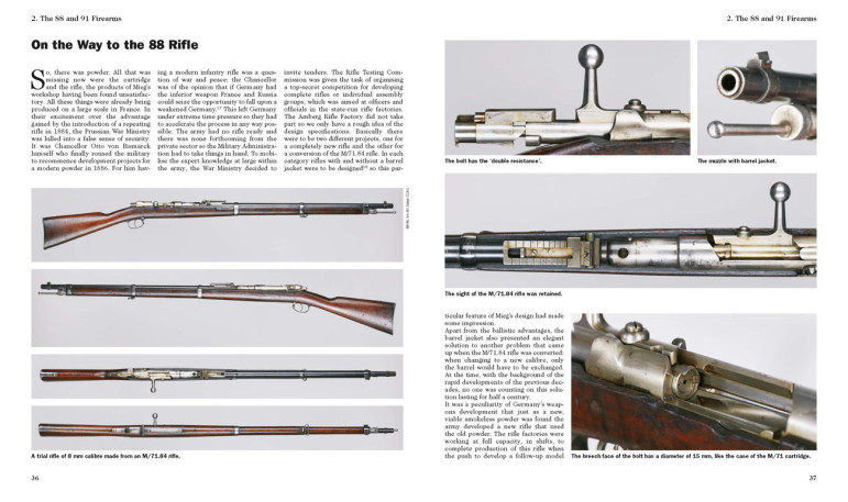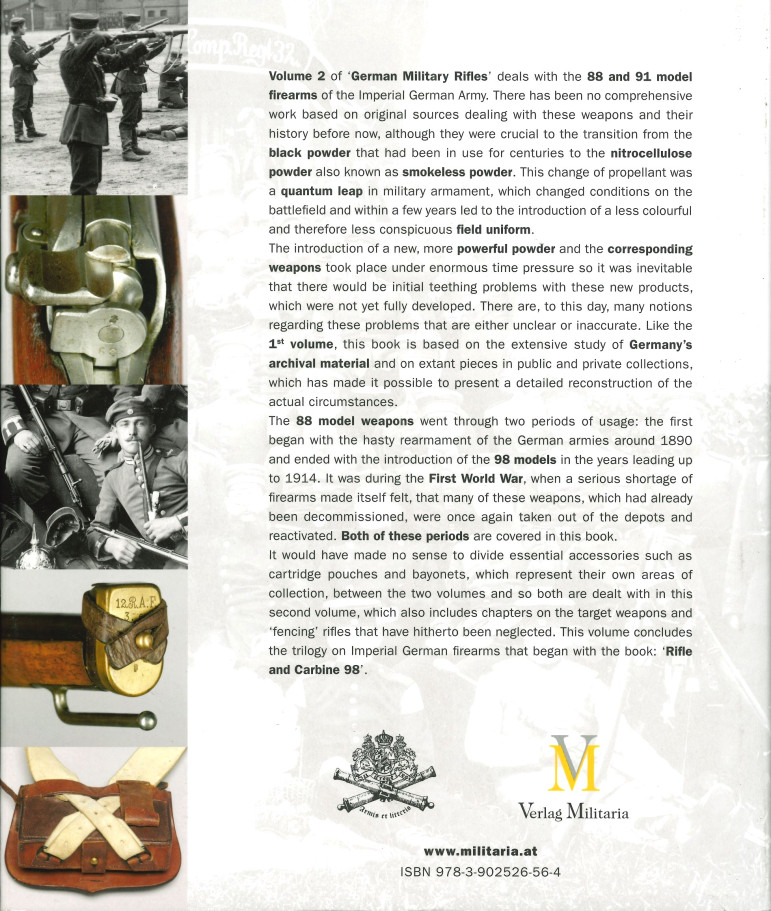 Le volume 2 de «German Military Rifles» traite des modèles d'armes à feu 88 et 91 de l'armée impériale allemande. Il n'y a pas eu de travail complet basé sur des sources originales traitant de ces armes et de leur histoire jusqu'à présent, bien qu'elles aient été cruciales pour la transition de la poudre noire utilisée depuis des siècles, à la poudre de nitrocellulose également connue sous le nom de poudre sans fumée. Ce changement de propulseur a constitué un bond en avant dans l'armement militaire, qui a changé les conditions sur le champ de bataille et a conduit en quelques années à l'introduction d'un uniforme de campagne moins coloré et donc moins visible.
