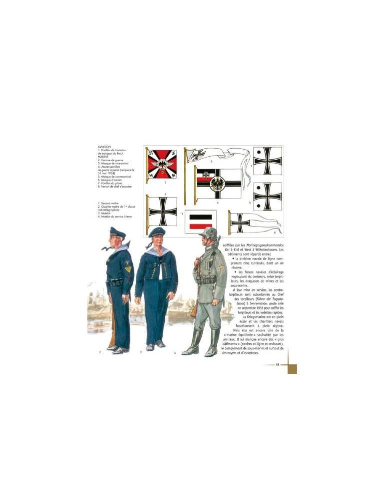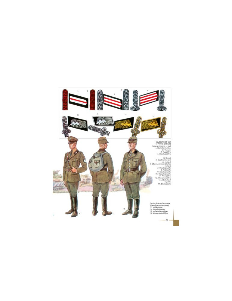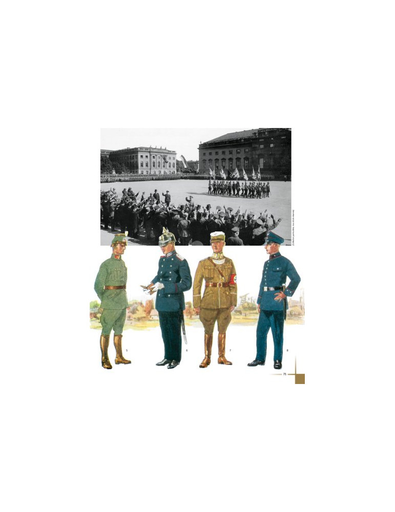 Issu d’un document illustré édité à Berlin en 1933, ce livre présente les uniformes des différentes unités et organismes étatiques et politiques. On y découvre ainsi les forces armées classiques telles que la marine ou l’aviation, mais également douaniers, gardes forestiers ou membres du parti nazi.