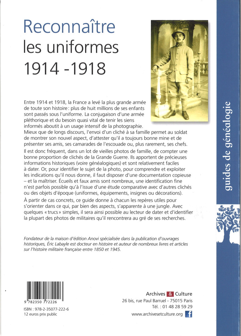 A partir de cas concrets, ce guide donne à chacun les repères utiles pour s'orienter dans ce qui, par bien des aspects, s'apparente à une jungle. Avec quelques "trucs" simples, il sera ainsi possible au lecteur de dater et d'identifier la plupart des photos de militaires qu'il rencontrera au gré de ses recherches.