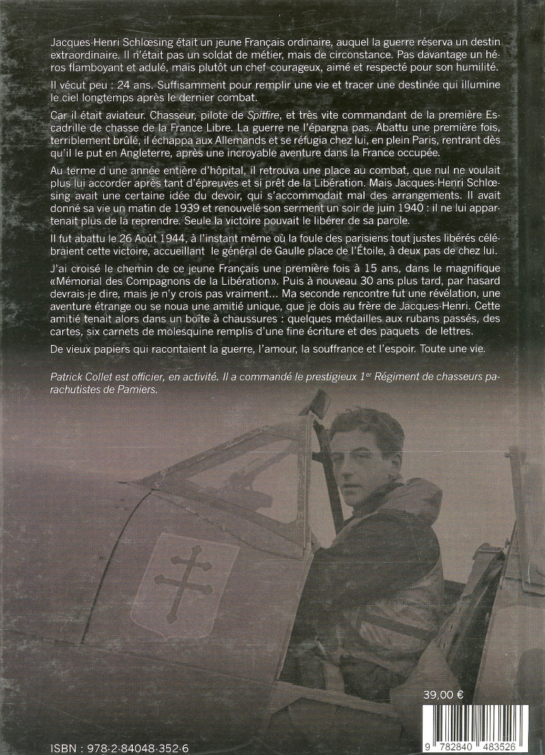 Jacques Henri Schlœsing a choisi la liberté en 1940, à 20 ans, une fois pour toutes. Ce choix avait un prix : sa vie, qu’il offrait avec ses services, en rejoignant à Londres un général inconnu mais décidé à se battre. Jeune étudiant parisien devenu pilote de chasse de la Royal Air Force, il est de tous les combats au sein de la première escadrille de la France Libre. Calme et courageux, camarade admiré et aimé, Schlœsing est surtout très vite reconnu comme un chef de grande classe. A 23 ans, nommé capitaine, il prend le commandement du groupe Ile de France, volant de succès en succès. Jusqu’à ce jour de l’hiver 1943, où il saute d’un avion en flammes au dessus de la France occupée.