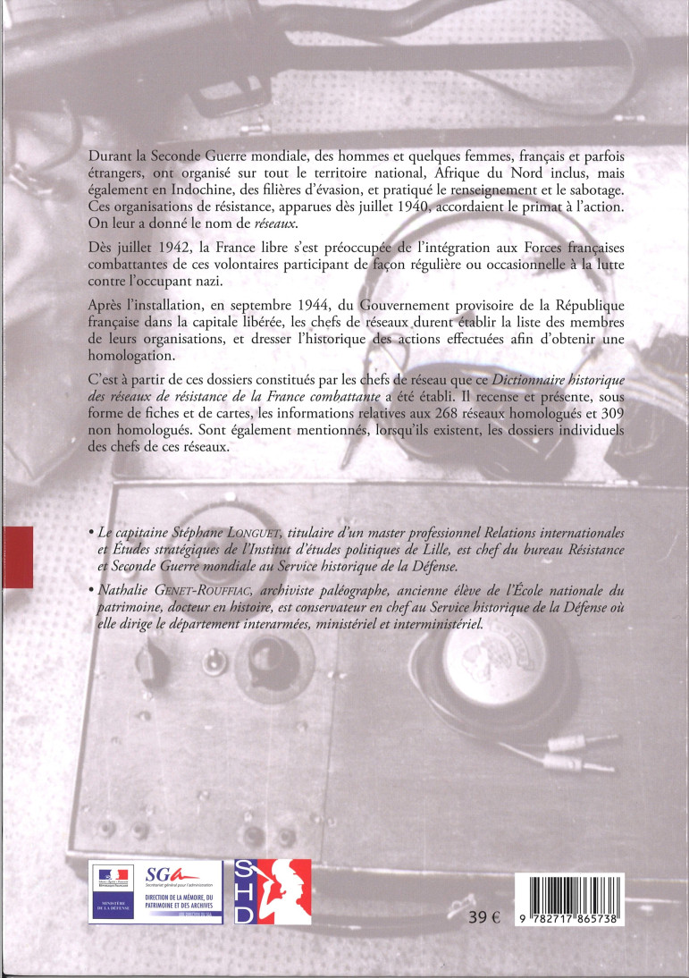 C'est à partir de ces dossiers constitués par les chefs de réseau que ce Dictionnaire historique des réseaux de résistance de la France combattante a été établi. Il recense et présente, sous forme de fiches et de cartes, les informations relatives aux 268 réseaux homologués et 309 non homologués. Sont également mentionnés, lorsqu'ils existent, les dossiers individuels des chefs de ces réseaux.