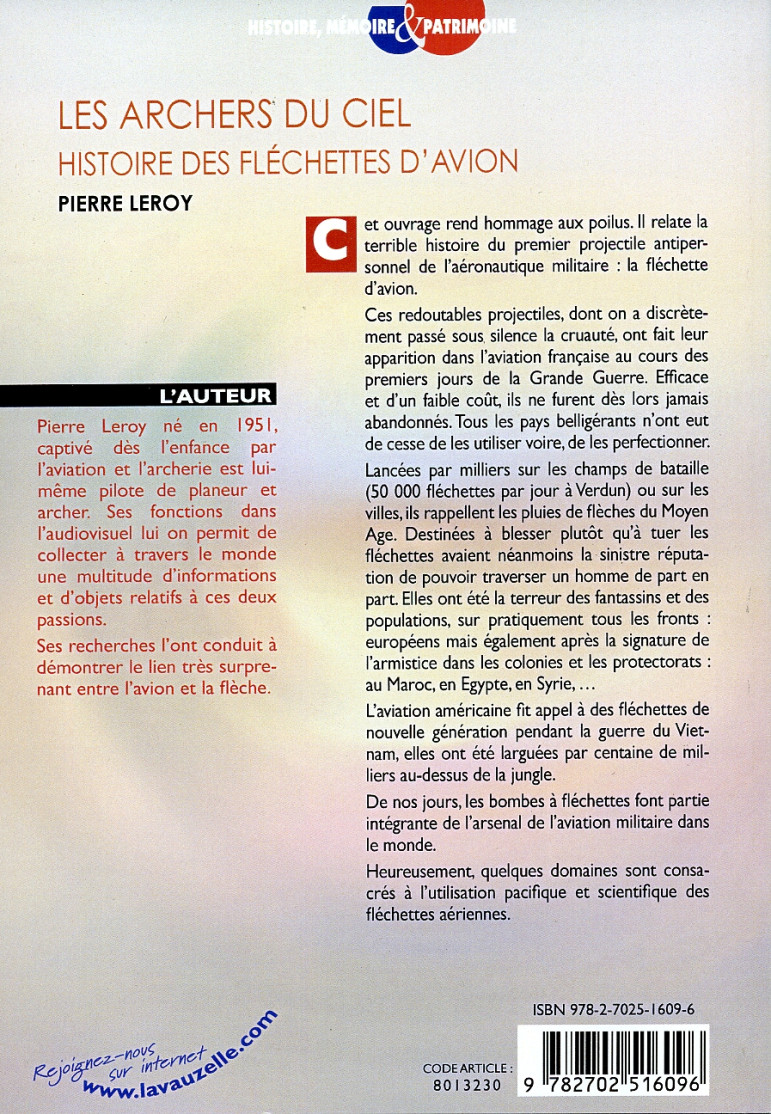 Cet ouvrage rend hommage aux poilus. Il relate la terrible histoire du premier projectile antipersonnel de l'aéronautique militaire : la fléchette d'avions. Ces redoutables projectiles, dont on a discrètement passé sous silence la cruauté, ont fait leur apparition dans l'aviation française au cours des premiers jours de la Grande Guerre. Efficace et d'un faible coût, ils ne furent dès lors jamais abandonnés.