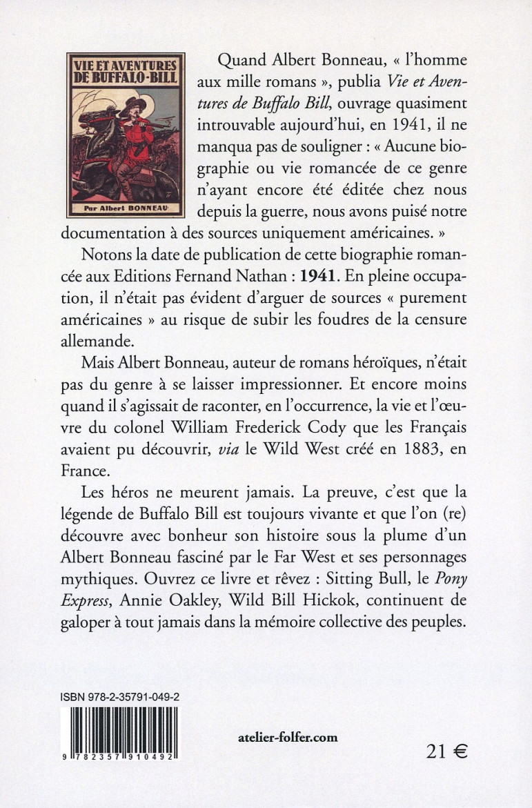 Quand Albert Bonneau, "l'homme aux mille romans", publia Vie et Aventures de Buffalo Bill, ouvrage quasiment introuvable aujourd'hui, en 1941, il ne manqua pas de souligner : "Aucune biographie ou vie romancée de ce genre n'ayant encore été éditée chez nous depuis la guerre, nous avons puisé notre documentation à des sources uniquement américaines." Notons la date de publication de cette biographie romancée aux Editions Fernand Nathan : 1941.