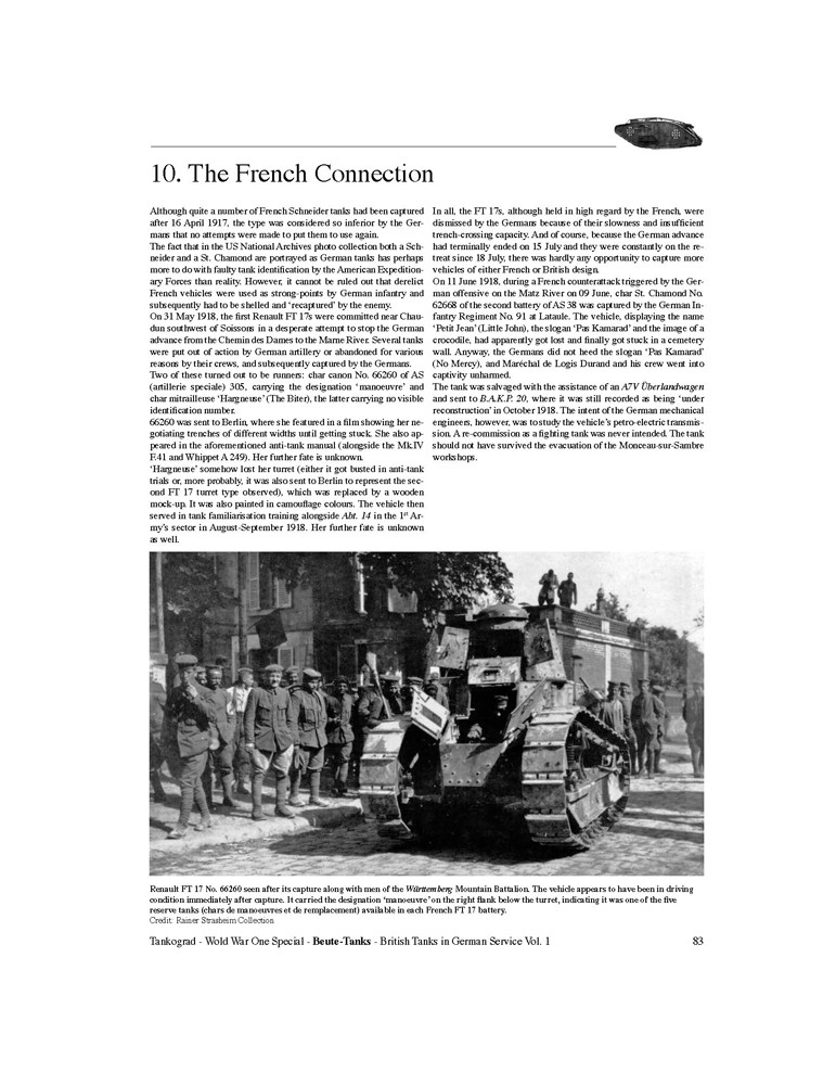 La naissance de la Panzerwaffe allemande pendant la Première Guerre mondiale est pour de nombreux passionnés principalement liée au développement de l'Allemagne, l'A7V. Cependant, il est indéniable que la plupart des chars servant du côté allemand pendant la Grande Guerre étaient d'origine britannique. Les Mk.IV Beute-Tanks britanniques capturés ont façonné le cœur des ambitions allemandes vers un propre corps blindé. Cette publication en deux volumes offre pour la première fois un aperçu vraiment complet de la capture et du déploiement de ces véhicules en proposant des chapitres sur :