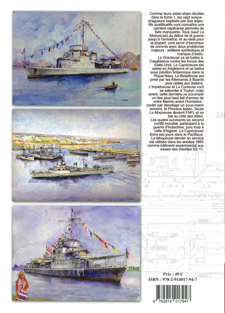 Pour le tome 2, comme leurs sister-ships étudiés dans le tome 1, les avisos-dragueurs baptisés par des adjectifs qualificatifs vont connaître une carrière captivante jalonnée de faits marquants.( La Batailleuse, La Capricieuse, La Gracieuse, La Boudeuse, L'Impétueuse, La Curieuse & La Moqueuse) . Les quatre survivants au second conflit mondial participent à la guerre d'Indochine, puis trois à celle d'Algérie. La Capricieuse finira ses jours dans le Pacifique, La Moqueuse, dernier en service est utilisée dans les années 1960 comme bâtiment expérimentale aux essais des missiles SS 11.