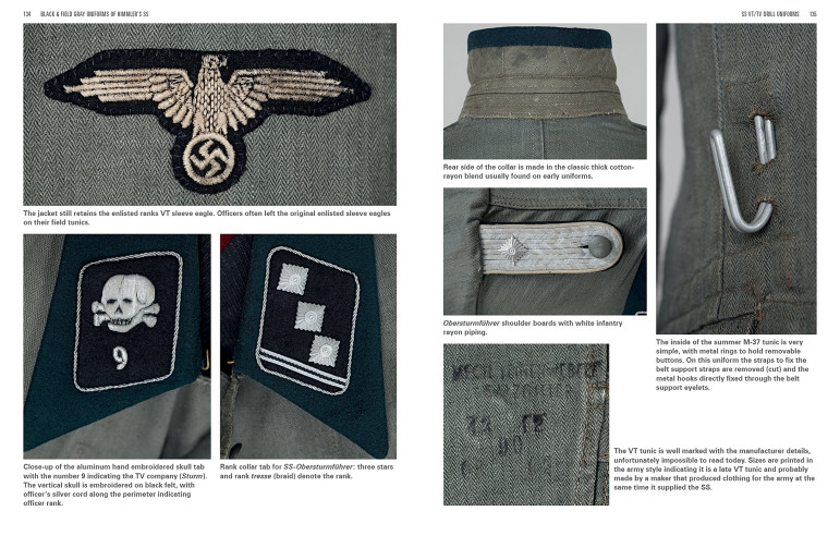 Le texte explique des détails importants sur la création, la fabrication et l'utilisation de chaque article. Des photos d'époque illustrent le port de chaque pièce présentée dans les livres. Les deux volumes présentent les différents casques, casquettes, pantalons, tuniques et vestes sur près de 900 pages avec plus de 1 400 images en couleurs, d'avant la Seconde Guerre mondiale et de la Seconde Guerre mondiale.
