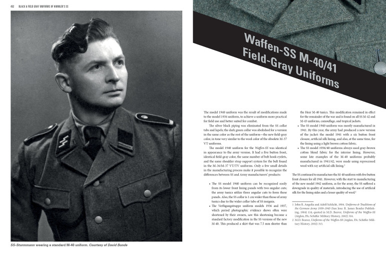 Le texte explique des détails importants sur la création, la fabrication et l'utilisation de chaque article. Des photos d'époque illustrent le port de chaque pièce présentée dans les livres. Les deux volumes présentent les différents casques, casquettes, pantalons, tuniques et vestes sur près de 900 pages avec plus de 1 400 images en couleurs, d'avant la Seconde Guerre mondiale et de la Seconde Guerre mondiale.