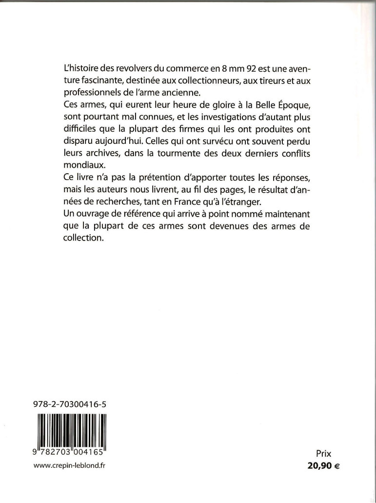 L'histoire des revolvers du commerce en 8 mm 92 est une aventure fascinante, destinée aux collectionneurs, aux tireurs et aux professionnels de l'arme ancienne. Ces armes, qui eurent leur heure de gloire à la Belle époque, sont pourtant mal connues, et les investigations d'autant plus difficiles que la plupart des firmes qui les ont produites ont disparu aujourd'hui. Celles qui ont survécu ont souvent perdu leurs archives, dans la tourmente des deux derniers conflits mondiaux.