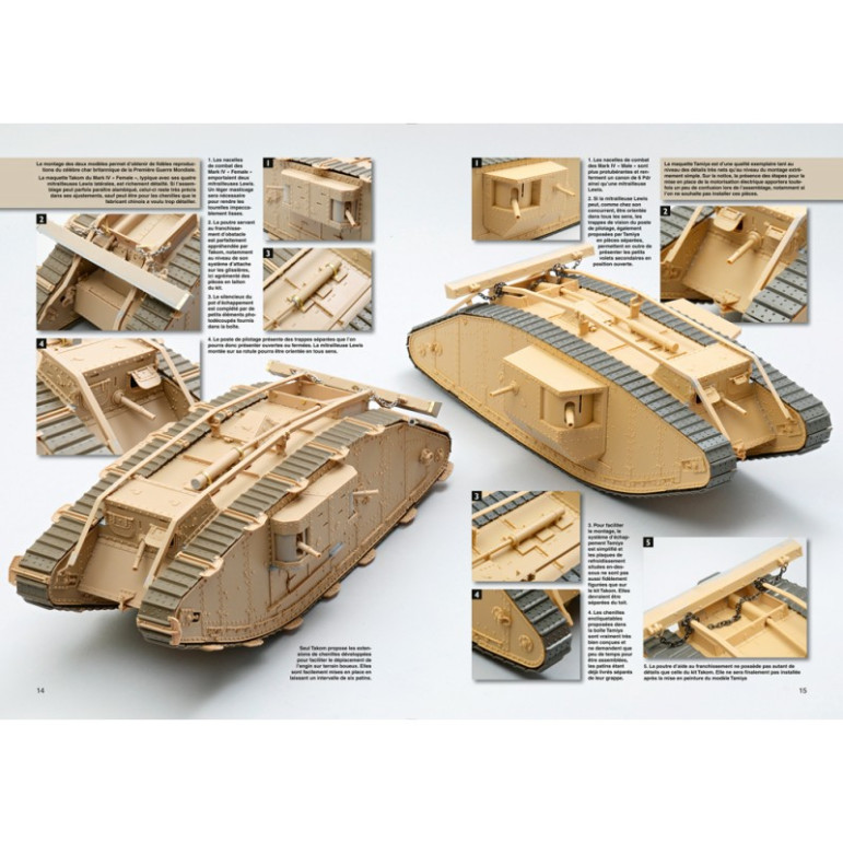 Cet ouvrage, dédié aux maquettistes, est destiné à la réalisation des maquettes de chars de la Première Guerre mondiale et détaille avec précision les étapes de montage, de peinture et de réalisation des dioramas pour chacun des 6 modèles : le Mark IV « Male » anglais, le Mark IV « Female » et A7V allemand, le Schneider CA, le Saint-Chamond et le Renault FT français.