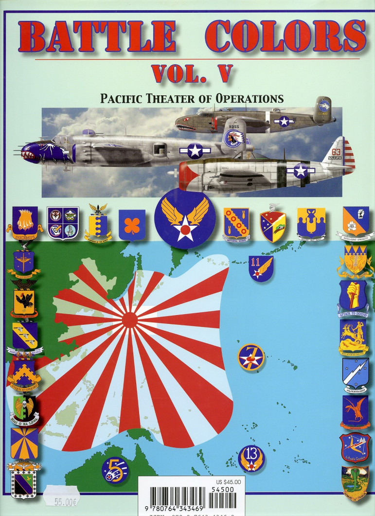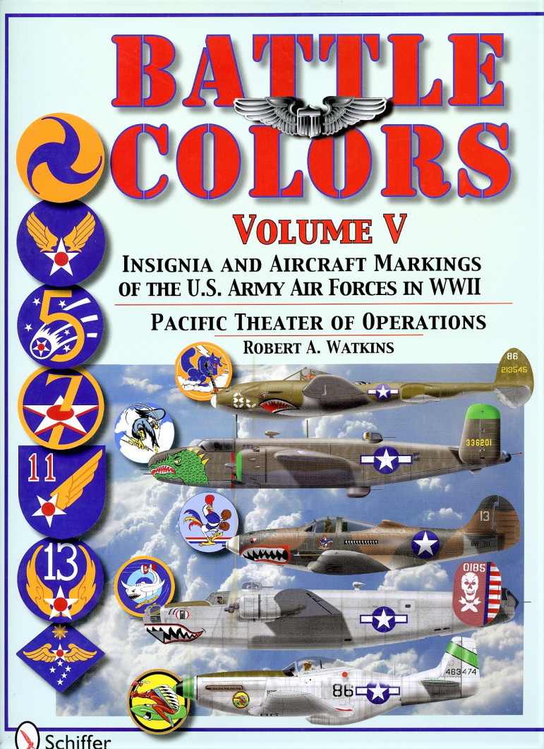 Le volume cinq de la série Battle Colours est consacré au théâtre d'opérations du Pacifique en mettant l'accent sur les 5th, 7th, 11th et 13th US Army Air Forces. Comme pour les volumes précédents, ce travail met principalement l'accent sur les emblèmes de groupe / escadron en plus des marques tactiques des avions de combat.