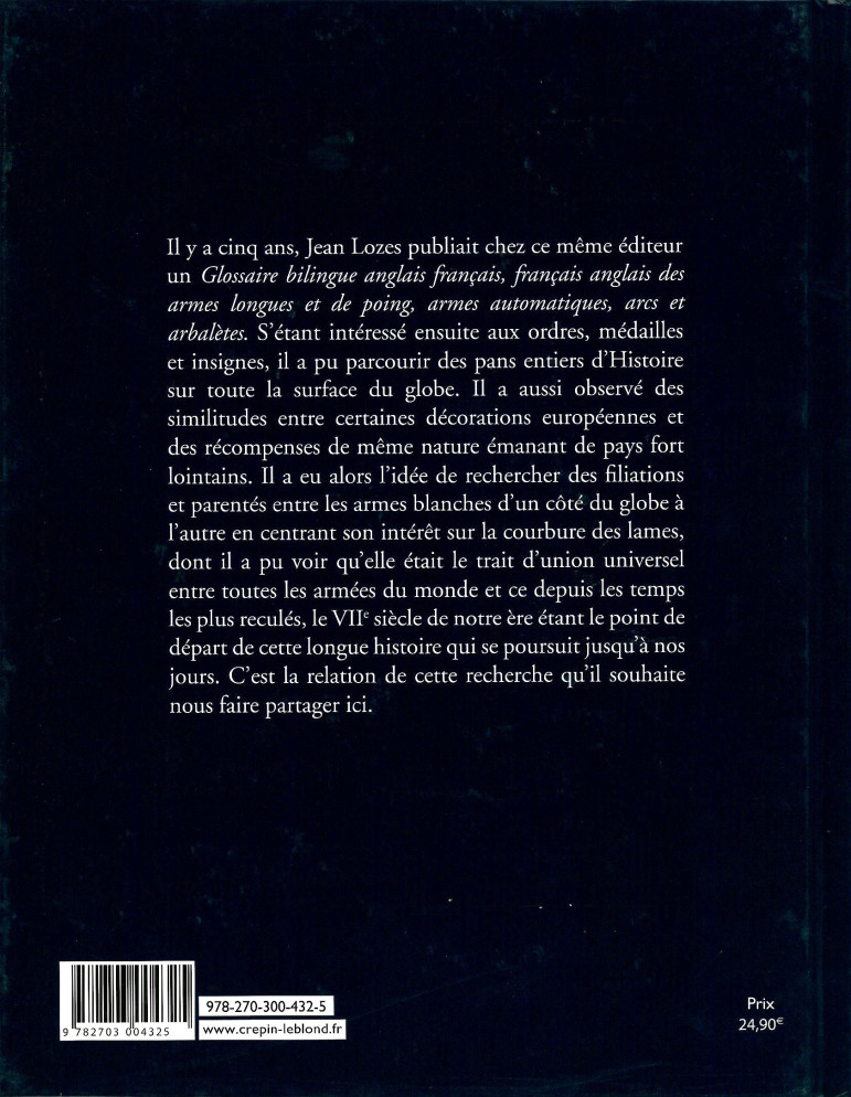 Il y a cinq ans, Jean Lozes publiait chez ce même éditeur un Glossaire bilingue anglais français, français anglais des armes longues et de poing, armes automatiques, arcs et arbalètes. S'étant intéressé ensuite aux ordres, médailles et insignes, il a pu parcourir des pans entiers d'Histoire sur toute la surface du globe. Il a aussi observé des similitudes entre certaines décorations européennes et des récompenses de même nature émanant de pays fort lointains.