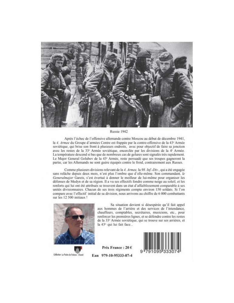 La température descend si bas que de nombreux cas de gelures sont signalés très rapidement. Le Major General Golubev de la 43e Armée, reste persuadé que ses troupes gagneront la partie, car les Allemands ne sont guère équipés contre le froid, contrairement aux Russes. Comme plusieurs divisions relevant de la 4. Armee, la 98. Inf.-Div., qui a été engagée sans relâche depuis deux mois, n’est plus l’ombre que d’elle-même. Son commandant, le Generalmajor Gareis, s’est évertué à donner le meilleur de lui-même pour organiser les défenses de Medyn et de sa région. Il a vu ses effectifs fondre comme neige au soleil, et les renforts qui lui ont été attribués se trouvent dans un état d’affaiblissement comparable à ses unités divisionnaires. Chacun de ses trois régiments compte environ 150 soldats. Si l’on compare avec l’effectif initial de sa division, nous arrivons au chiffre de 6 000 combattants sur les 12 500 initiaux !