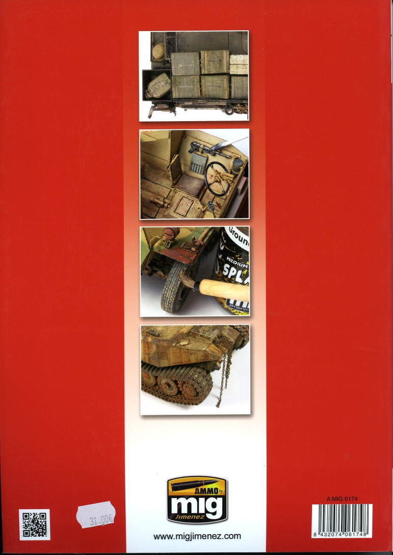Le Volume n° 5 présente en profondeurs les explications pour traiter la peinture et les étapes de vieillissement des chenilles, roues de camions et de voitures, les échappements, outils, câbles de remorquage, armes personnelles et mitrailleuses, antennes, ainsi que les pièces transparentes des périscopes et points de vision. Le maquettiste apprendra aussi à peindre et vieillir tous les types d’objets en bois comme les caisses de munitions et de ravitaillement, les pièces en métal comme les jerricans d’eau, de carburant et d’huile, les éléments en tissu comme les bâches, les drapeaux et les protections de mantelet. Enfin, nous traiterons des éléments naturels comme les rochers, la terre, les feuilles morts, les petits branchages, et l’herbe. De plus, vous pourrez admirer une galerie des modèles principaux utilisés dans cette encyclopédie ainsi qu’un tableau des techniques les plus importantes utilisées sur chaque exemple pour y avoir rapidement accès.