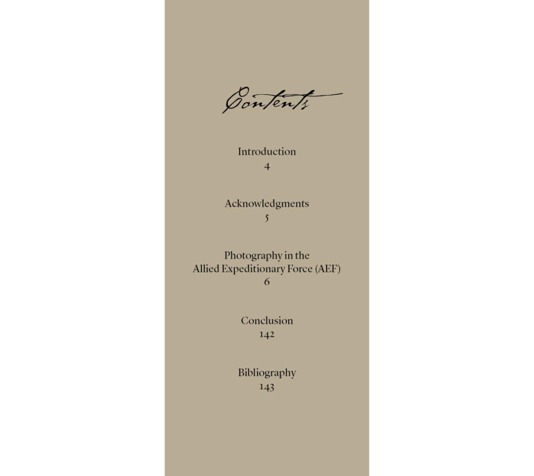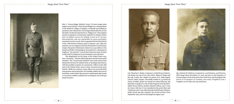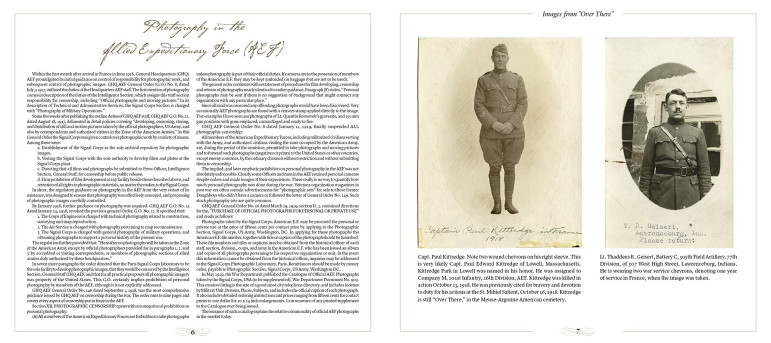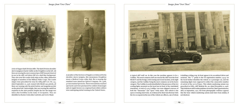 Photos de camp et portraits formels pris à leur retour aux États-Unis, voici un aperçu en profondeur de ce à quoi ressemblait l'AEF alors qu'elle était activement engagée dans la dernière partie de la 1ère GM. Ces images couvrent tous les grades des soldats de l'AEF, du général Pershing aux jeunes soldats , et toutes les spécialités professionnelles, du fantassin au cuisinier. Les détails des uniformes et de l'équipement, les emplacements, les heures et les lieux ont été minutieusement recherchés pour chaque image.