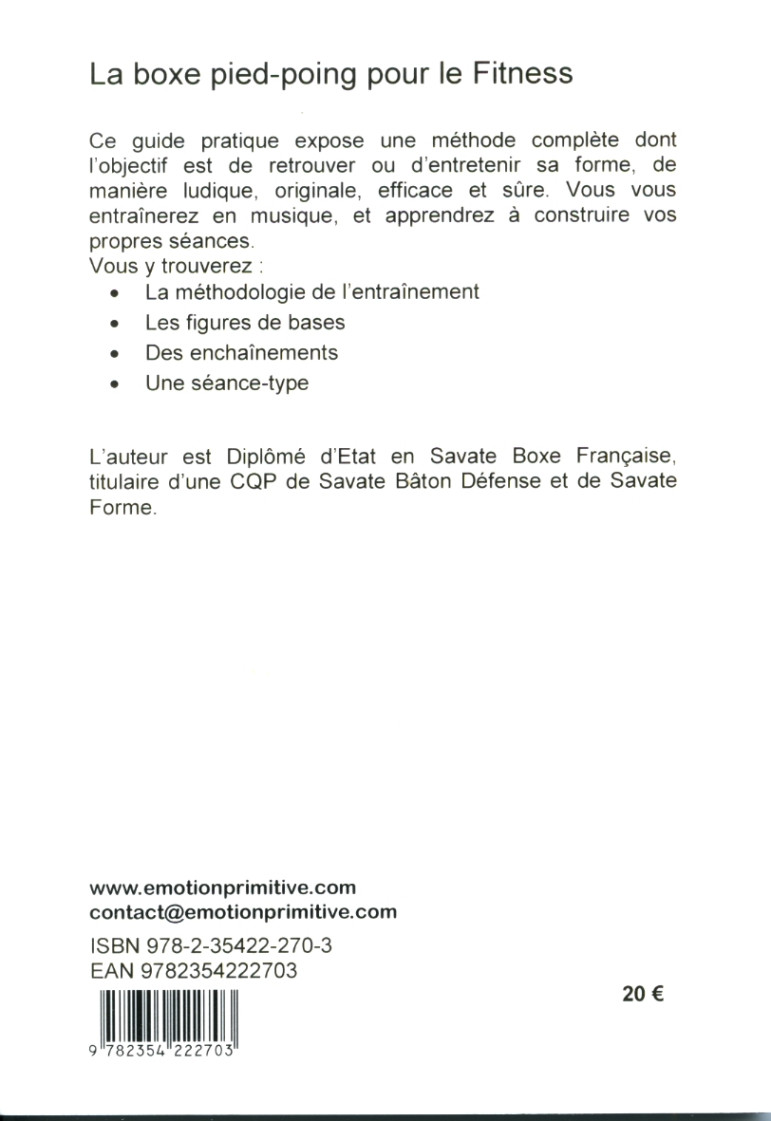 Ce guide pratique expose une méthode complète dont l'objectif est de retrouver ou d'entretenir sa forme, de manière ludique, originale, efficace et sûre. Vous vous entraînerez en musique, et apprendrez à construire vos propres séances. Vous y trouverez : la méthodologie de l'entraînement ; les figures de bases ; des enchaînements ; une séance-type. L'auteur est Diplômé d'Etat en Savate Boxe Française, titulaire dune CQP de Savate Bâton Défense et de Savate Forme.