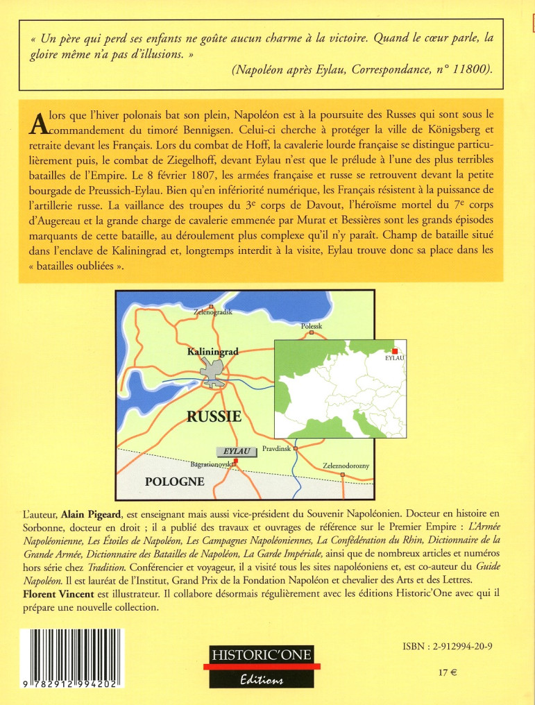 La vaillance des troupes du 3e corps de Davout, l’héroïsme mortel du 7e corps d’Augereau et la grande charge de cavalerie emmenée par Murat et Bessières sont les grands épisodes marquants de cette bataille, au déroulement plus complexe qu’il n’y paraît. Champ de bataille situé dans l’enclave de Kaliningrad et, longtemps interdit à la visite, Eylau trouve donc sa place dans les « batailles oubliées ».