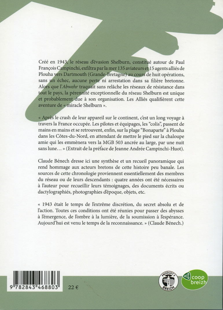 Les alliés qualifièrent cette aventure de « Miracle Shelburn ». Claude Bénech retrace le dernier chapitre de l'évasion, par mer, des aviateurs alliés. « Après le crash de leur appareil sur le continent, c est un long voyage à travers la France occupée. Les pilotes et équipages, les colis , passent de mains en mains et se retrouvent, enfin, sur la plage « Bonaparte » à Plouha dans les Côtes-du-Nord, en attendant de mettre le pied sur la chaloupe amie qui les emmènera vers la MGB 503 ancrée au large, par une nuit sans lune » (extrait de la préface de Jeanne Andrée Campinchi-Huot).