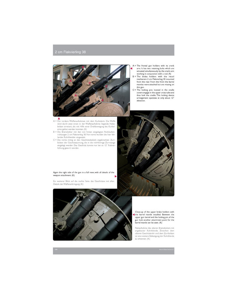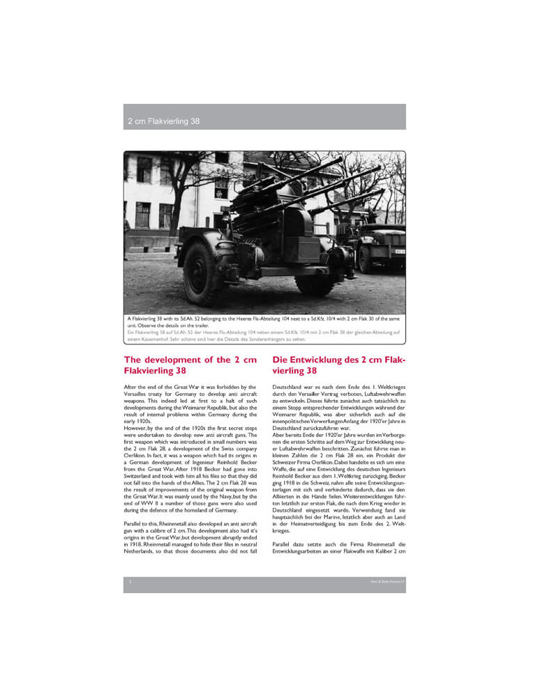 Pour la première fois dans la littérature spécialisée, une description technique détaillée du canon de DCA est donnée avec une mise en évidence des viseurs utilisés, car la plupart des modifications de construction du canon sont directement liées aux viseurs. L'historique de service du Flakvierling est également décrit avec des schémas d'organisation et des photos historiques montrant l'arme de 1940 à la fin de la guerre, ainsi qu'un examen complet et un exemple des modèles disponibles à ce moment.