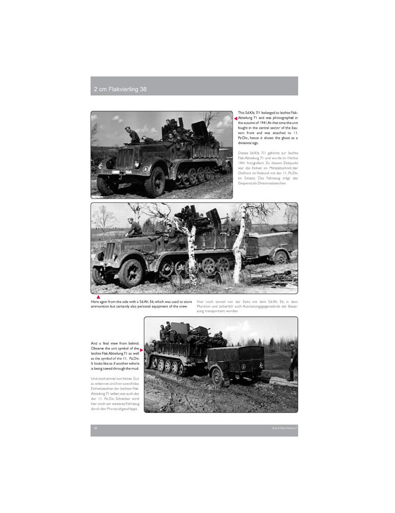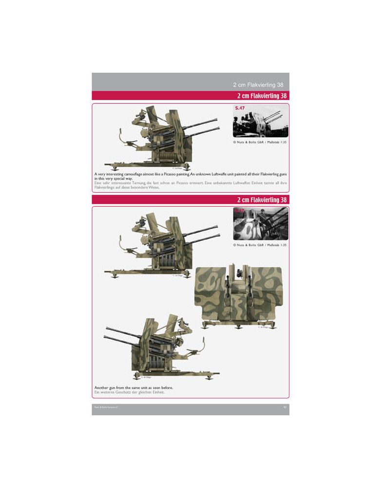 Ce volume contient environ 336 photos, dont 169 clichés historiques tirés des manuels et de pièce au combat en n/b, dont un certain nombre inédits ; 149 photos couleur des armes survivantes dans les collections publiques et privées, 18 photos couleur du modèle de Tony Greenland, légendes anglais / allemand, 33 pages de texte anglais / allemand, 20 pages de dessins de toutes les versions à l'échelle 1:35 de John Rue, 12 schémas de camouflage de Carlos de Diego Vaquerizo, et tableaux d'organisation des unités ayant le Flakvierling (Kriegstärke-Nachweisungen KStN) dans leur inventaire