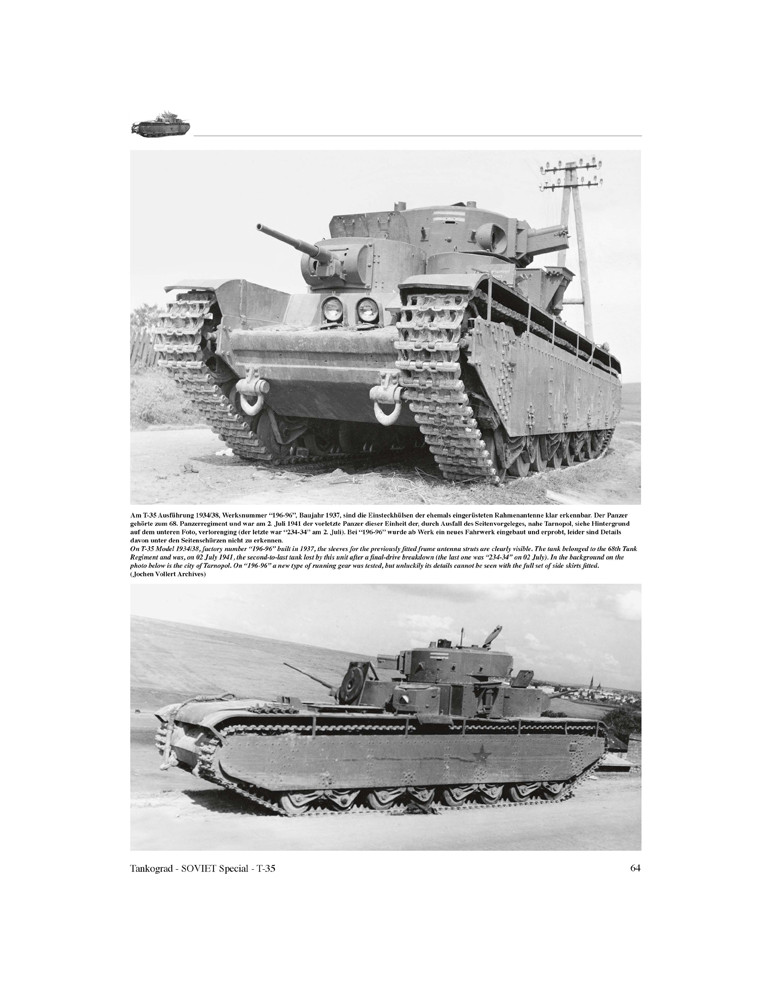 Cette publication couvre pour la première fois l'histoire complète du T-35 défectueux "Les géants du Front de l'est", leur développement, leur technologie, leurs lots de production et l'histoire fatidique des combats, illustrée principalement par des photographies inédites et de nombreux graphiques.