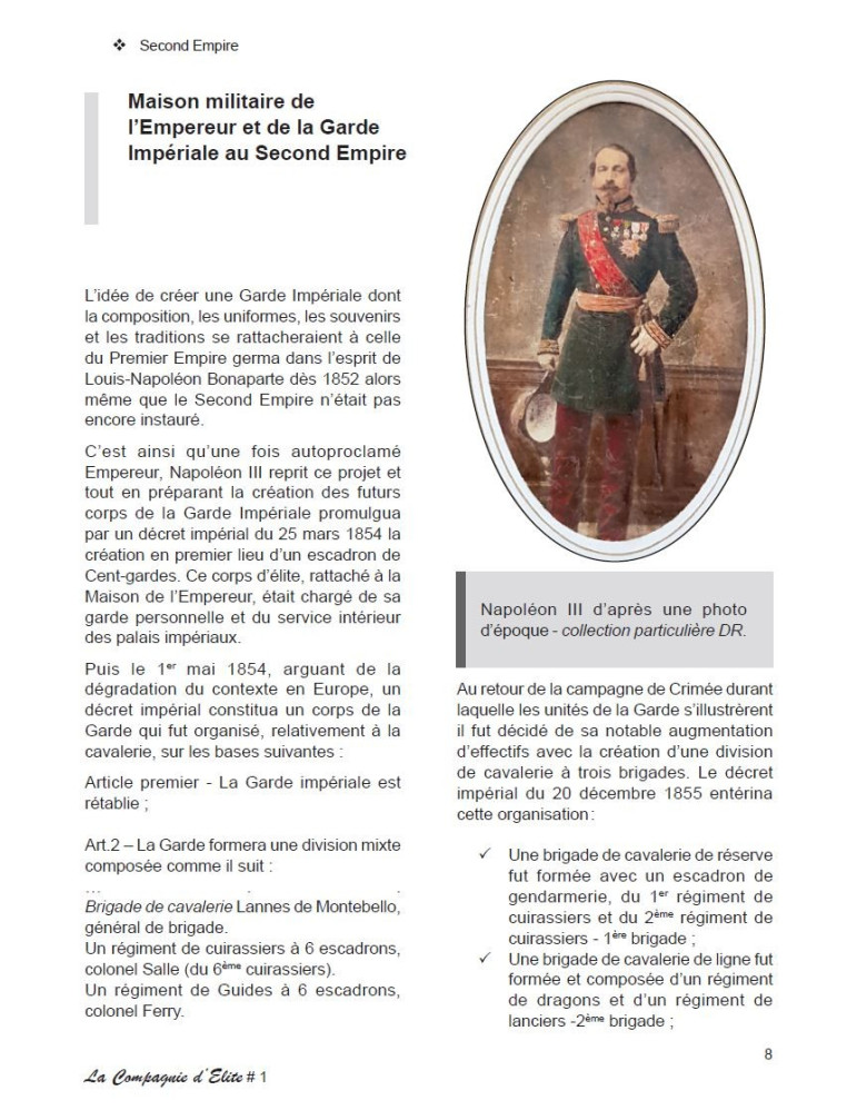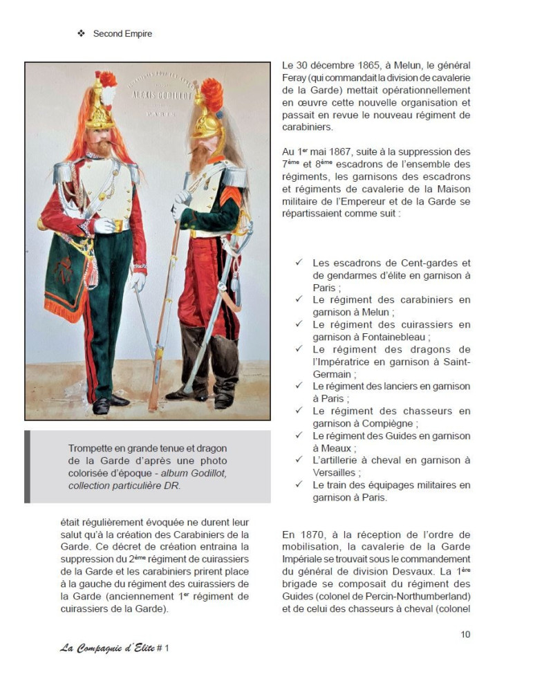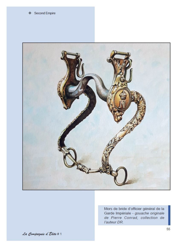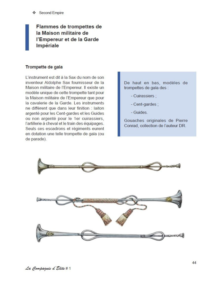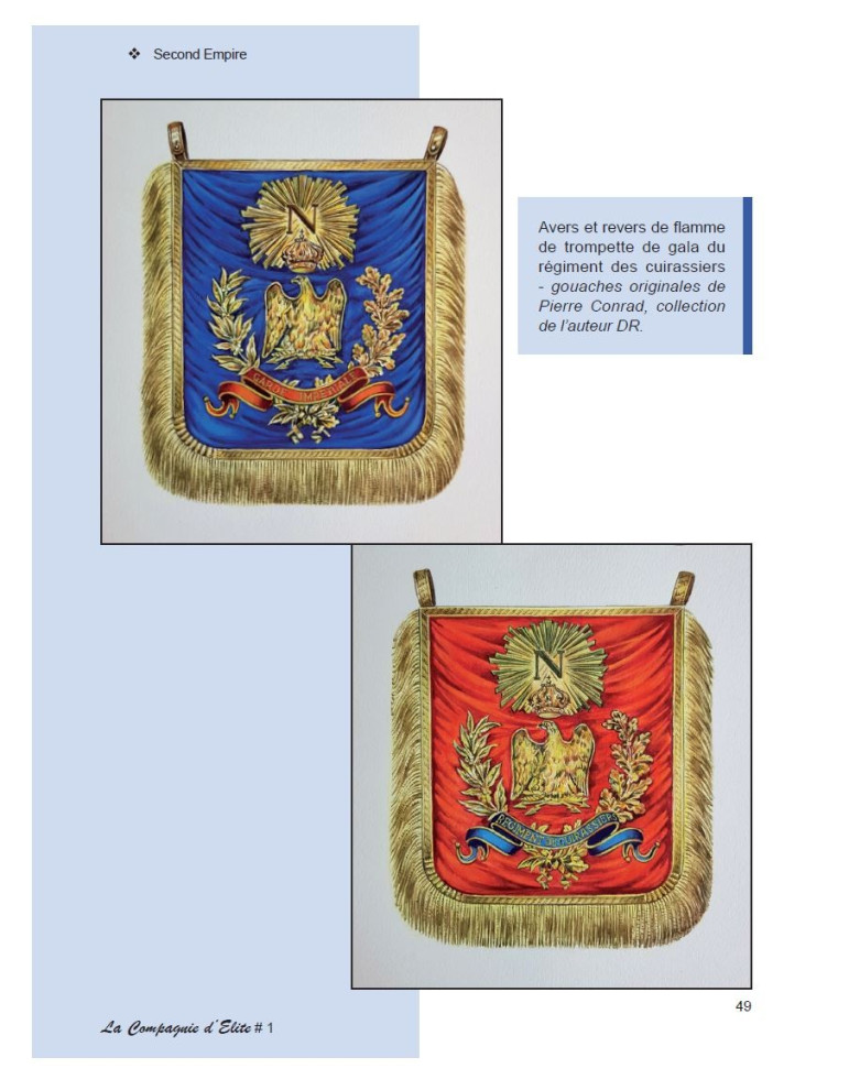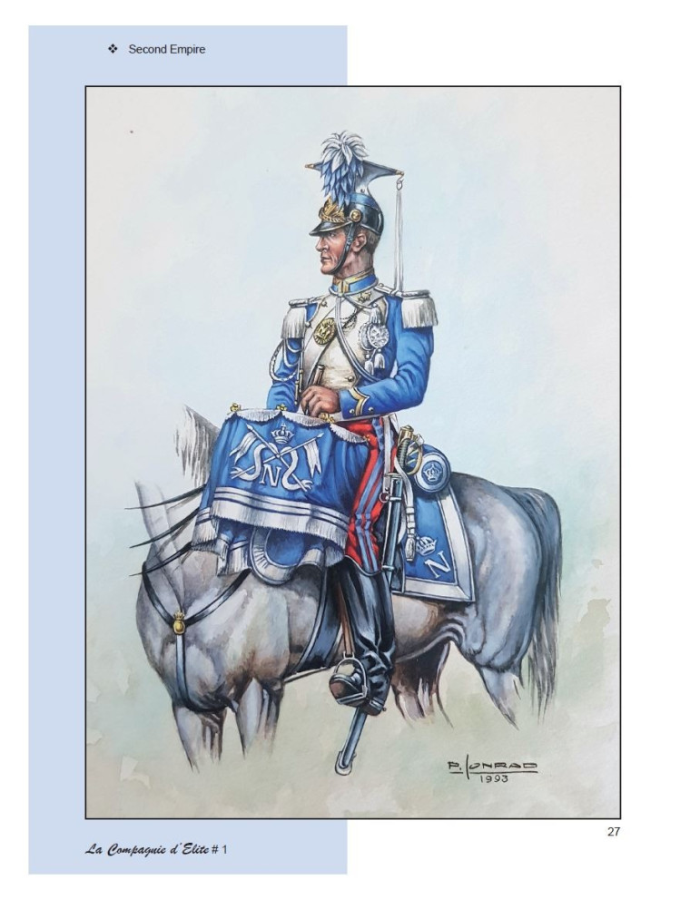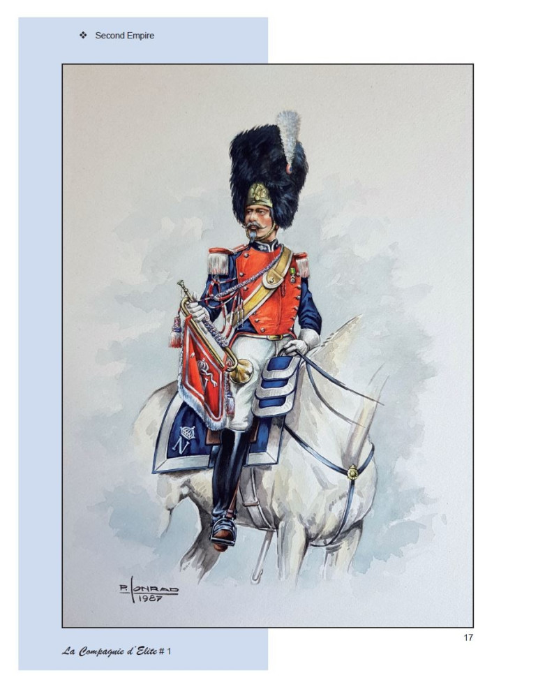 Dans ce premier cahier de la Compagnie d'Elite, c'est tout le panache des uniformes des timbaliers et trompettes de la Maison militaire de l'Empereur Napoléon III et de sa Garde Impériale dont nous nous imprégnons. Et ceci grâce à une série inédite de 36 gouaches de Pierre Conrad.