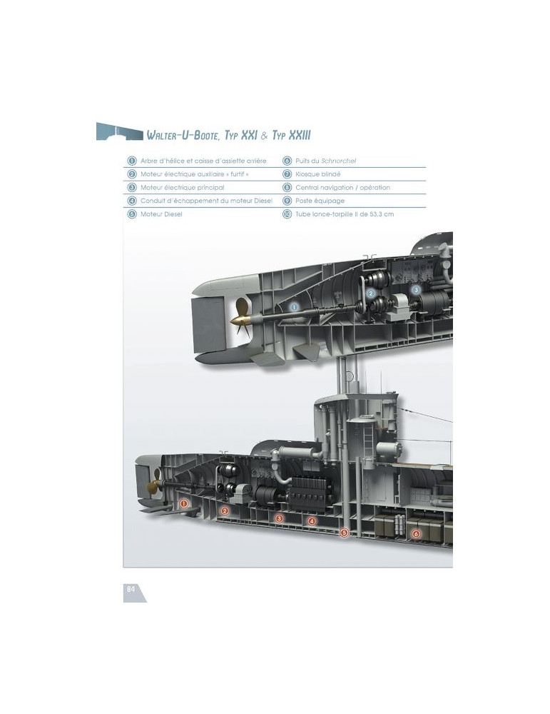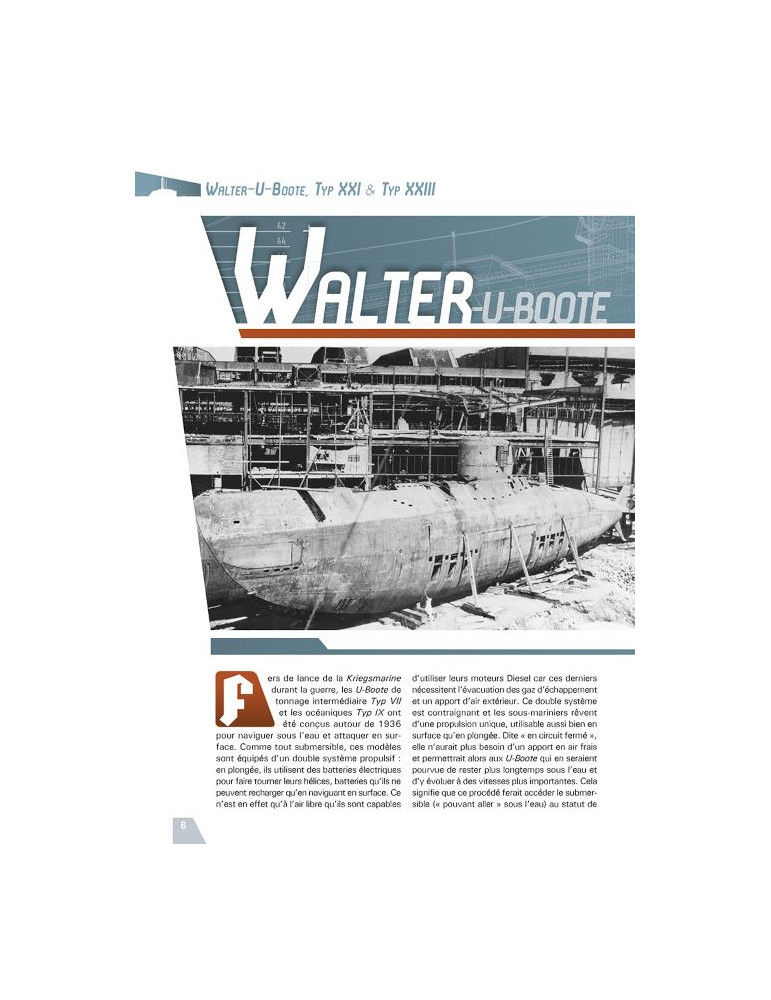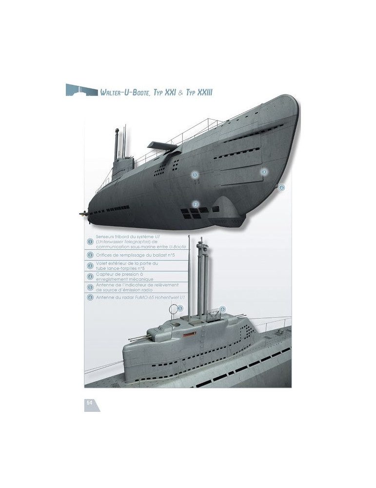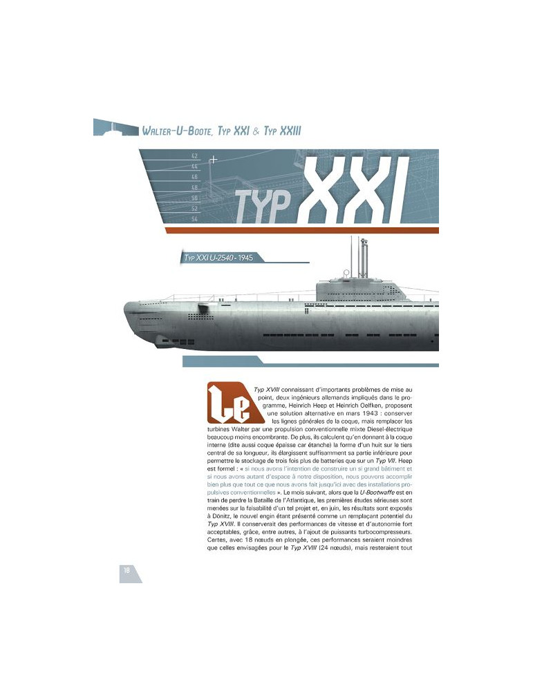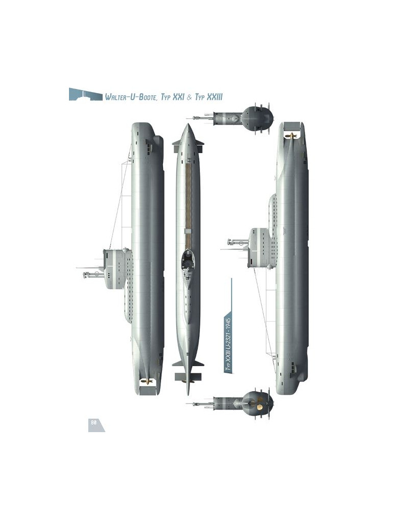 L'auteur commence par passer en revue les différents bâtiments équipés de la fameuse turbine « Walter » avant d'étudier les deux modèles les plus emblématiques de la fin du second conflit mondial que sont les Elektroboote Typ XXI et Typ XXIII.