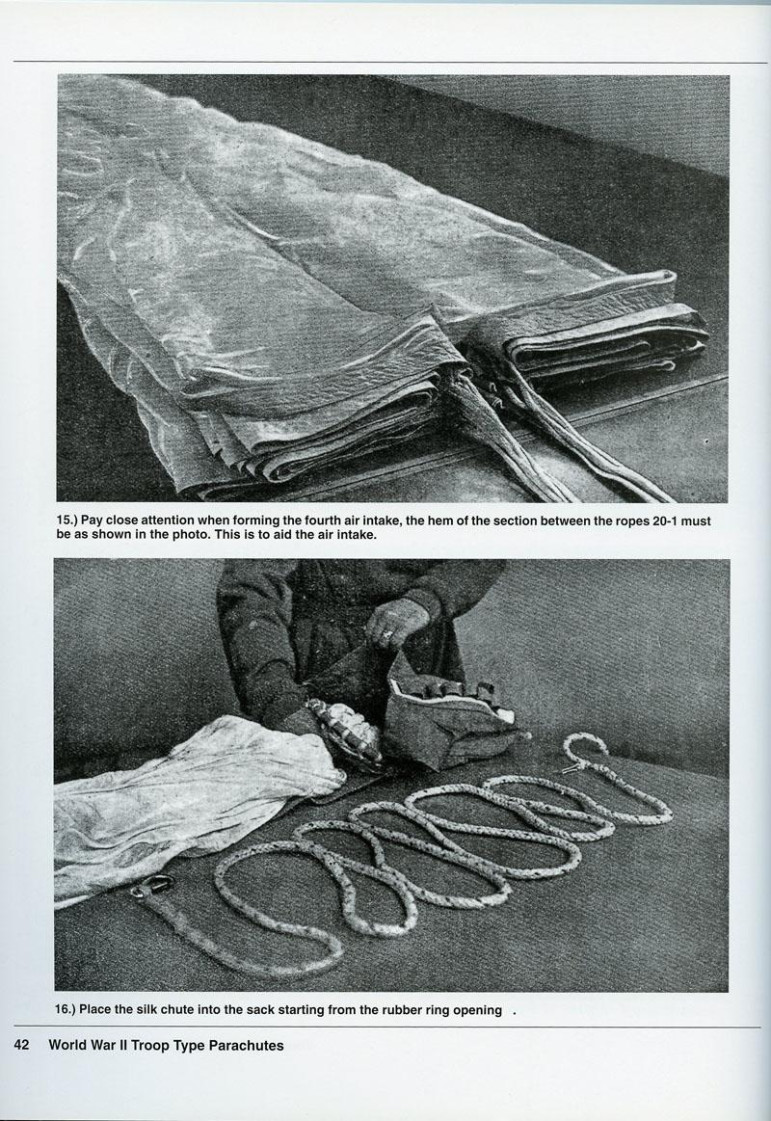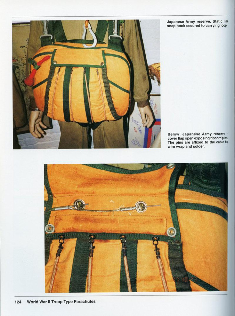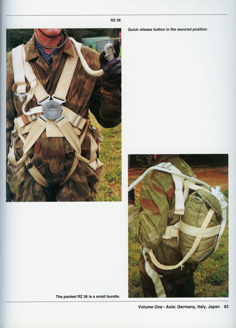 De plus, des données techniques, des dessins et des instructions de pliage sont incluses pour ceux qui possèdent ou trouvent un parachute d'époque. Le récit décrit l'histoire du développement, de l'équipement et de la technique d'emploi. Les avions, l'utilisation tactique, les uniformes et même les insignes sont mentionnés s'ils modifient ou réfutent ce qui a été précédemment accepté comme un fait.