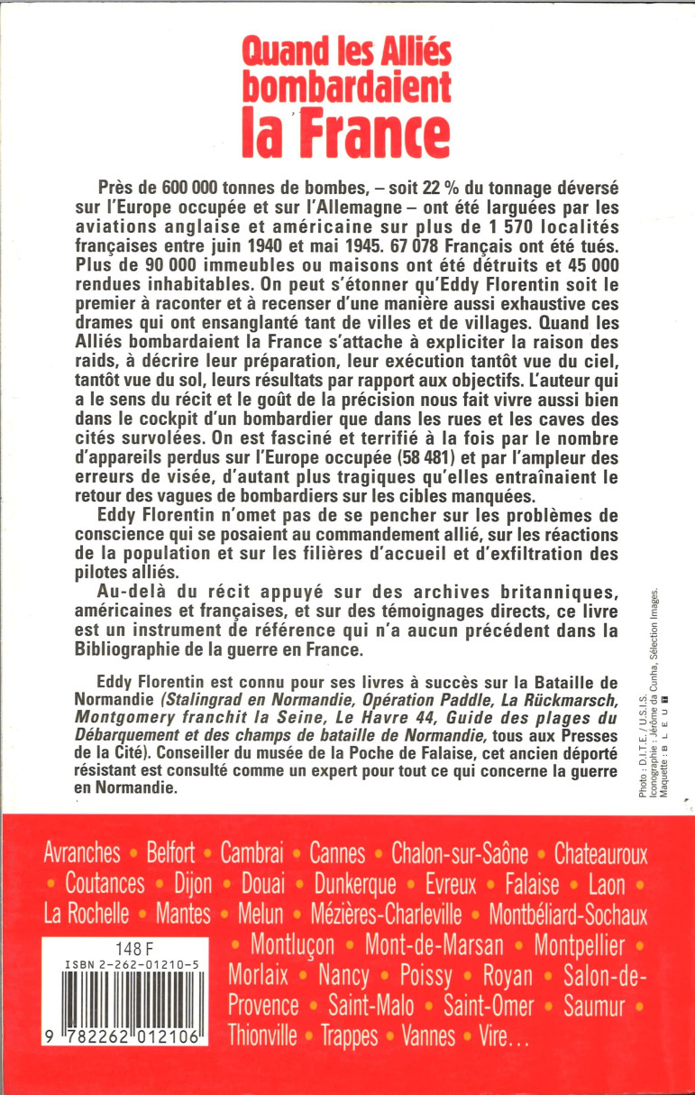 *BON ETAT* Près de 600 000 tonnes de bombes, - soit 22 % du tonnage déversé sur l'Europe occupée et sur l'Allemagne - ont été larguées par les aviations anglaise et américaine sur plus de 1 570 localités françaises entre juin 1940 et mai 1945. 67 078 Français ont été tués. Plus de 90 000 immeubles ou maisons ont été détruits et 45 000 rendues inhabitables. On peut s'étonner qu'Eddy Florentin soit le premier à raconter et à recenser d'une manière aussi exhaustive ces drames qui ont ensanglanté tant de villes et de villages. Quand les Alliés bombardaient la France s'attache à expliciter la raison des raids, à décrire leur préparation, leur exécution tantôt vue du ciel, tantôt vue du sol, leurs résultats par rapport aux objectifs. L'auteur qui a le sens du récit et le goût de la précision nous fait vivre aussi bien dans le cockpit d'un bombardier que dans les rues et les caves des cités survolées. On est fasciné et terrifié à la fois par le nombre d'appareils perdus sur l'Europe occupée (58 481) et par l'ampleur des erreurs de visée, d'autant plus tragiques qu'elles entraînaient le retour des vagues de bombardiers sur les cibles manquées. Eddy Florentin n'omet pas de se pencher sur les problèmes de conscience qui se posaient au commandement allié, sur les réactions de la population et sur les filières d'accueil et d'exfiltration des pilotes alliés. Au-delà du récit appuyé sur des archives britanniques, américaines et françaises, et sur des témoignages directs, ce livre est un instrument de référence qui n'a aucun précédent dans la Bibliographie de la guerre en France. Eddy Florentin est connu pour ses livres à succès sur la bataille de Normandie (Stalingrad en Normandie, Opération Paddle, La Rückmarsch, Montgomery franchit la Seine, Le Havre 44, Guide des plages du Débarquement et des champs de bataille de Normandie, tous aux Presses de la Cité). Conseiller du musée de la Poche de Falaise, cet ancien déporté résistant est consulté comme un expert pour tout ce qui concerne la guerre en Normandie.