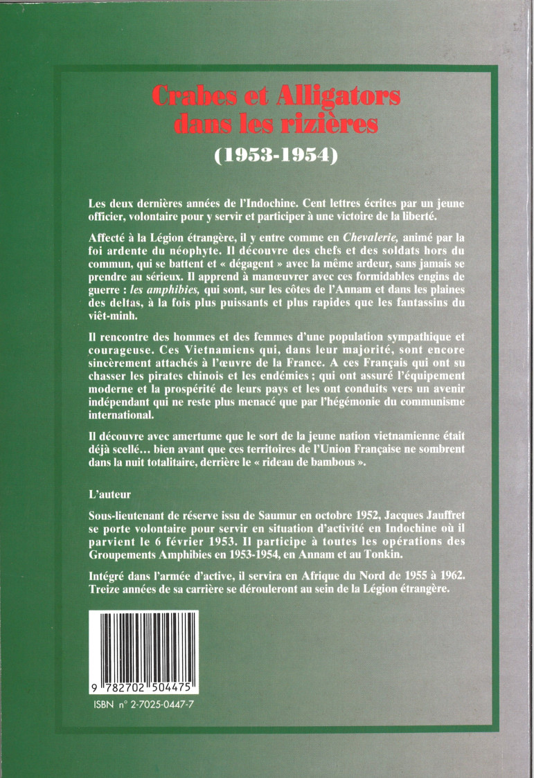 Les deux dernières années de l'Indochine. En 100 lettres, Jacques Jauffret, jeune officier au 1er REC (Régiment Etranger de Cavalerie) va nous faire vivre deux années de son séjour en Indochine. De par la nature du terrain, le 1er REC était équipé d’engins amphibies d’origine américaine. Au delà de ce témoignage de l’époque au raz des rizières et des rivières, l’originalité de ces lettres est qu’elles sont commentées 40 ans après avoir été écrites. Il s’agit donc d’un témoignage de première main analysé avec le recul.