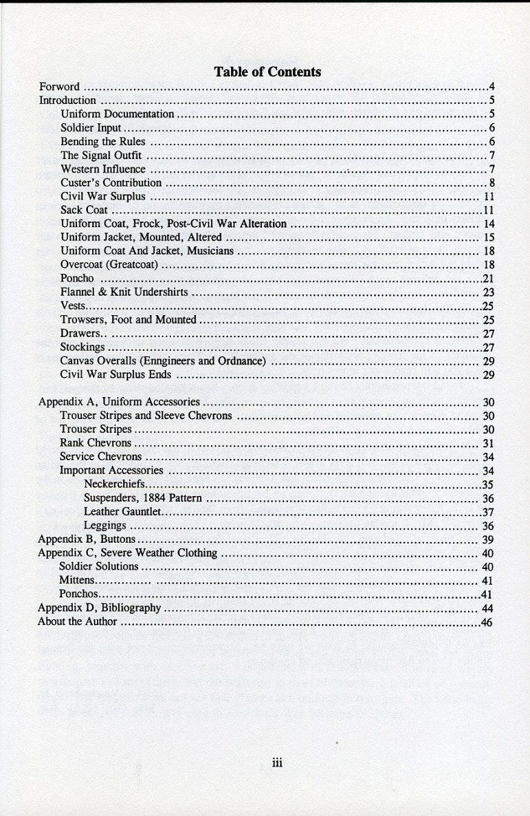 L'auteur retrace le développement de l'uniforme de l'armée américaine de la période de la guerre indienne développé à partir de ceux portés pendant la guerre civile et son évolution pour répondre aux conditions rencontrées dans les plaines, les déserts et dans les montagnes de l'ouest des États-Unis dans l'immédiat après-guerre. À l'aide de récits personnels, de dossiers des services généraux et de photographies d'époque, M. Rutledge fournit des textes et des identifications et trace une image fidèle et une explication sur ces uniformes inadéquats portés par les garnisons sous équipées à l'ouest du Mississippi.
