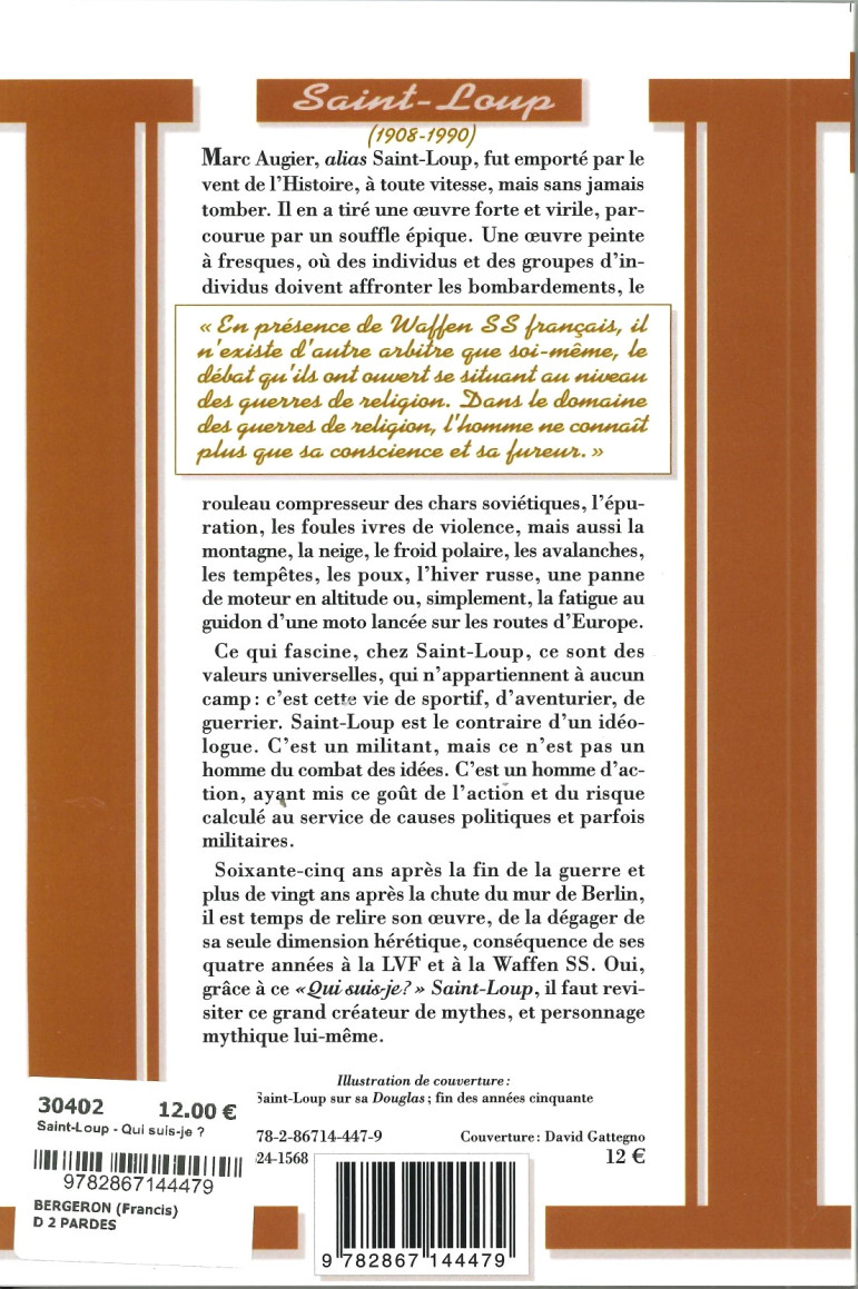 Saint-Loup (1908-1990): «En présence de Waffen SS français, il n'existe d'autre arbitre que soi-même, le débat qu'ils ont ouvert se situant au niveau des guerres de religion. Dans le domaine des guerres de religion, l'homme ne connaît plus que sa conscience et sa fureur.» Marc Augier, alias Saint-Loup, fut emporté par le vent de l'Histoire, à toute vitesse, mais sans jamais tomber.