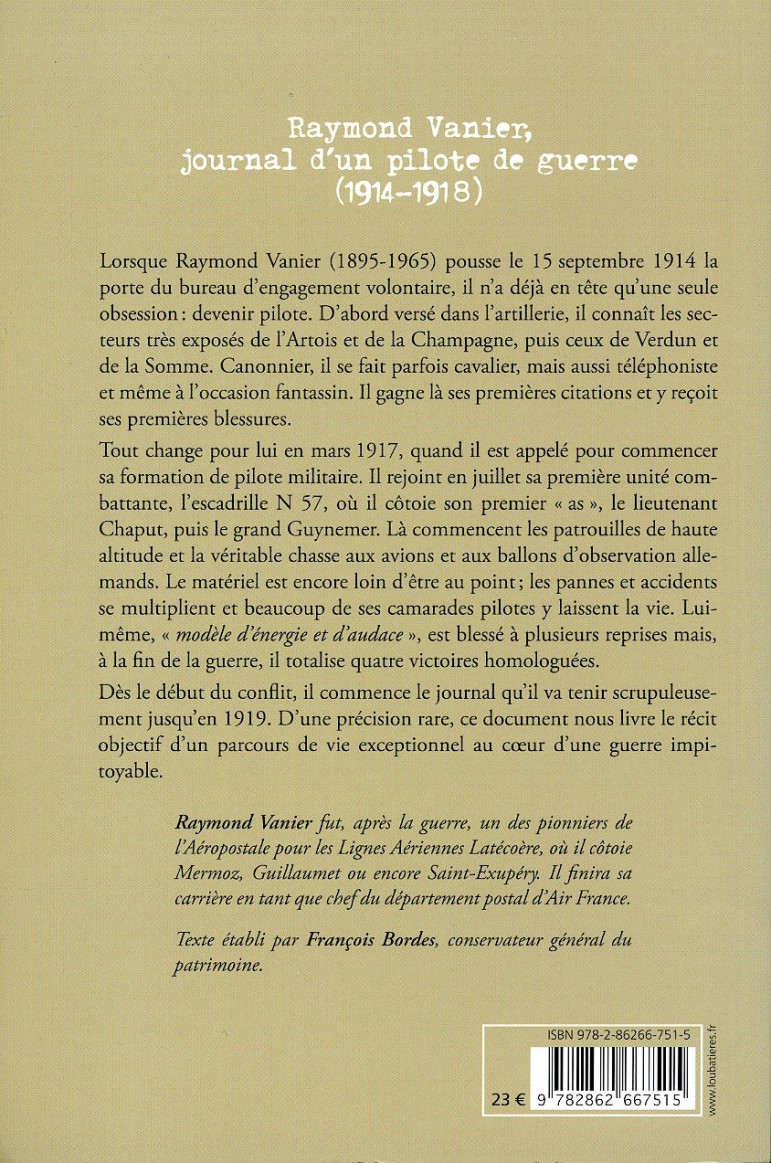 RAYMOND VANIER, JOURNAL D'UN PILOTE DE GUERRE (1914-1918)