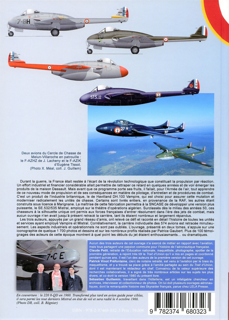 43 années de recherches ont été nécessaires aux trois auteurs, dont l'historien de l'aéronautique Patrick Vinot-Préfontaine, père de notre camarade Benjamin Vinot-Préfontaine (EA95-Gauthier), pour réaliser cette compilation exhaustive. Le premier tome reprend successivement l'histoire du de Havilland DH.100 Vampire et de sa version française SE.532/ 535 Mistral, avec son utilisation opérationnelle, la description technique détaillée des différentes versions avec force schémas et plans, puis énumère les unités dans lesquelles ils ont servi, en France et en Allemagne. Une importante annexe détaille la vie individuelle des 574 avions construits.