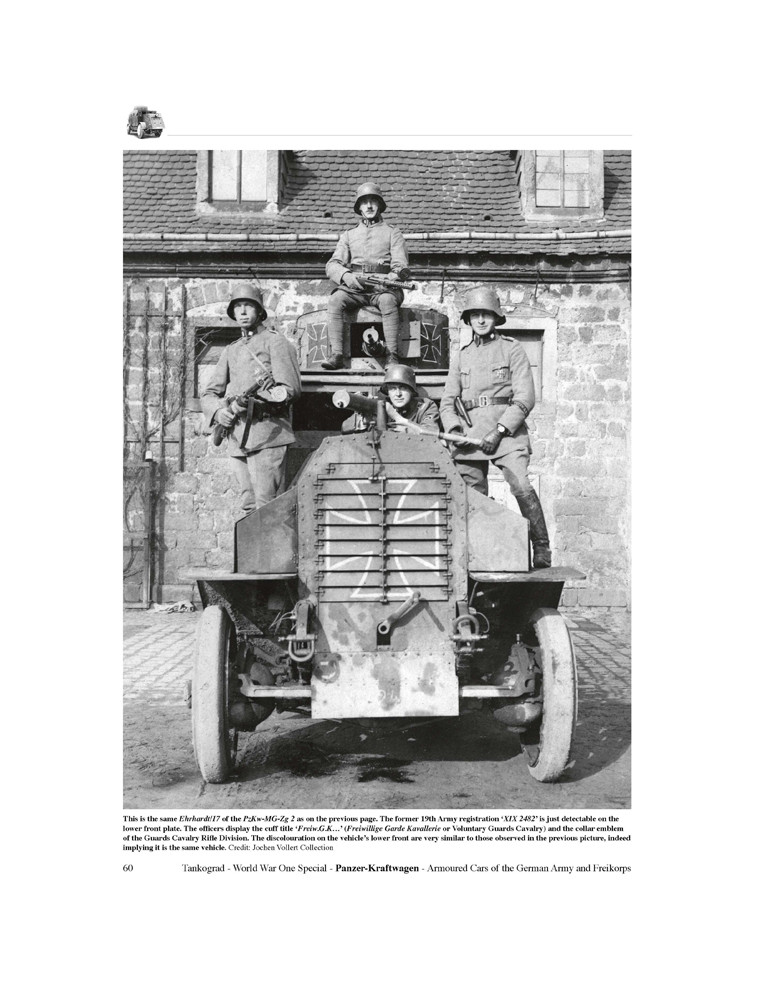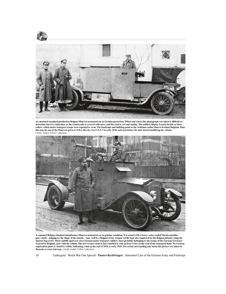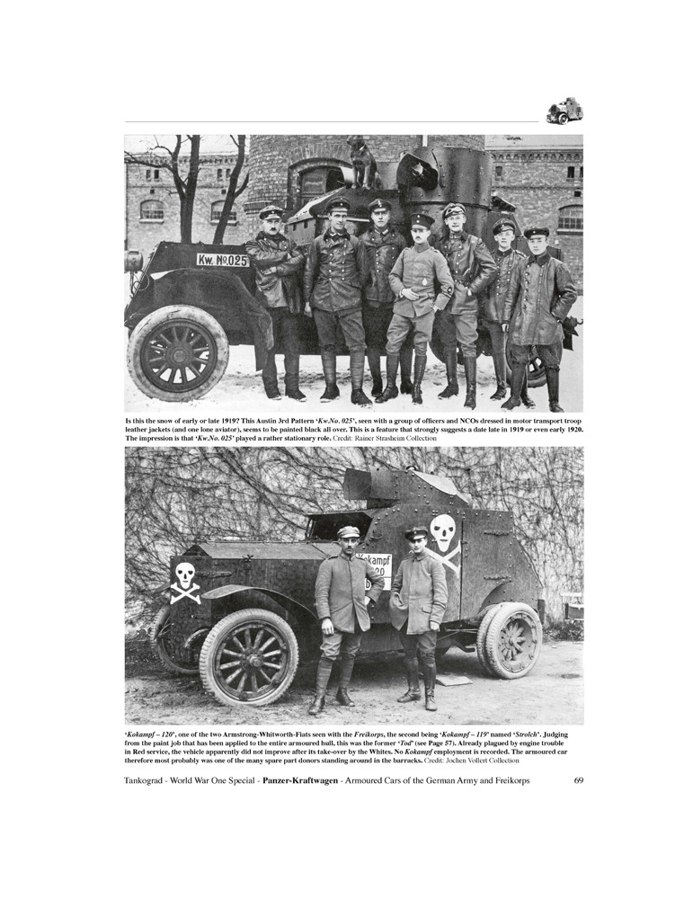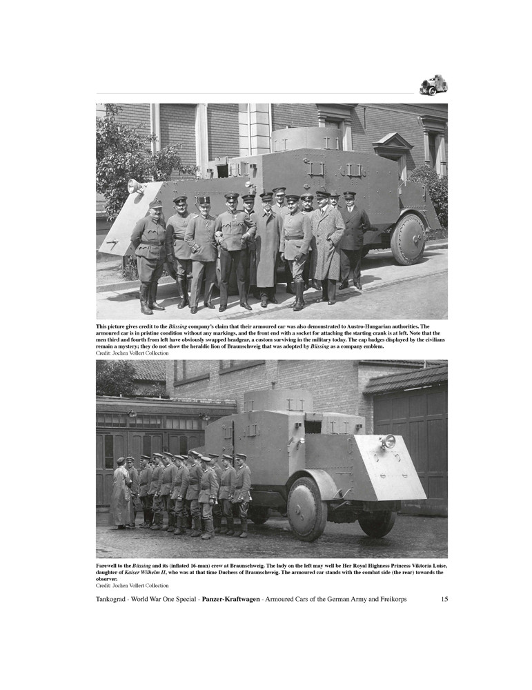 Cette publication décrit le développement, la conception et l'utilisation au combat - sur le front de l'Est et de l'Ouest - des trois types de voitures blindées allemandes construites par Ehrhardt, Daimler et Büssing pendant la guerre, ainsi que l'utilisation et le déploiement des nombreux types capturés fabriqués par Minerva, Austin , Garford-Putilov, Lancia, Fiat, Peugeot, Packard et d'autres qui ont servi sous la croix de fer à la fois dans l'armée impériale allemande en 1914-18 et plus tard dans le corps franc de 1918-20.