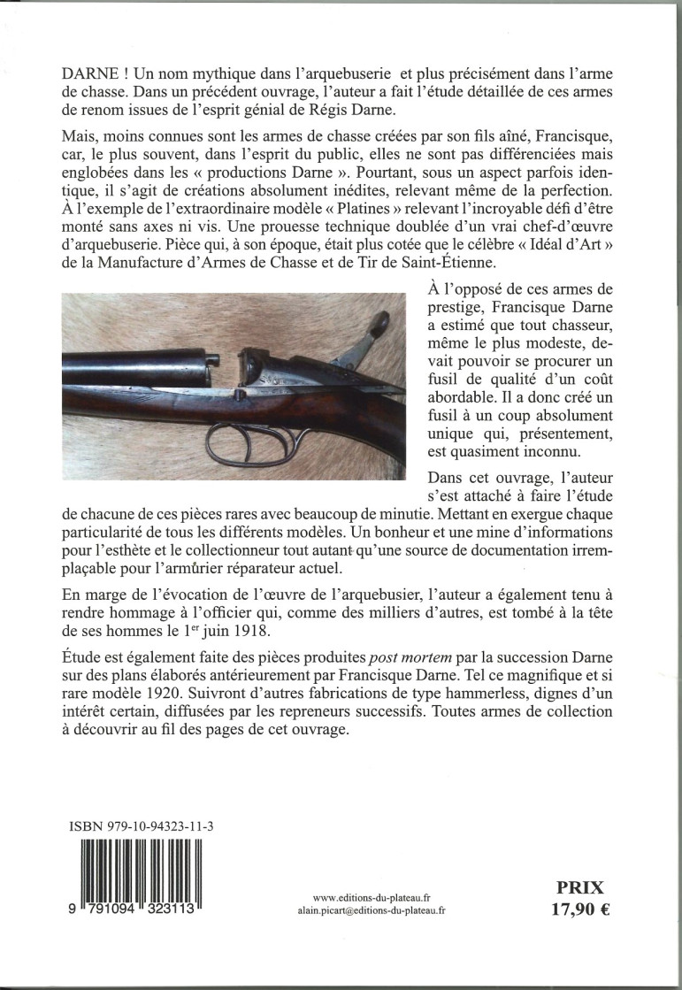 Un bonheur et une mine d'informations pour l'esthète et le collectionneur tout autant qu'une source de documentation irremplaçable pour l'armurier réparateur actuel. En marge de l'évocation de l'œuvre de l'arquebusier, l'auteur a également tenu à rendre hommage à l'officier qui, comme des milliers d'autres, est tombé à la tête de ses hommes le 1er juin 1918. Etude est également faite des pièces produites post mortem par la succession Darne sur des plans élaborés antérieurement par Francisque Darne.