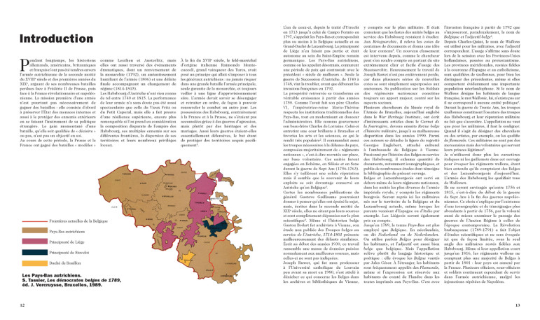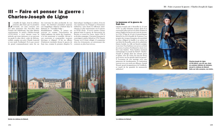 Le Musée royal de l’Armée et d’Histoire militaire de Bruxelles détient cependant quantité de témoignages matériels, imprimés et manuscrits de cette époque : ils sont tous exposés dans ce livre. Les châteaux de Belgique, et d’abord celui de Beloeil, ont autorisé la reproduction de leurs trésors de famille : portraits, plans de bataille en couleurs, armes, pièces d’équipements et d’uniformes. L’Université de Namur détient en sa bibliothèque deux fonds d’ouvrages anciens relatifs à Charles-Joseph de Ligne, feld-maréchal et écrivain.
