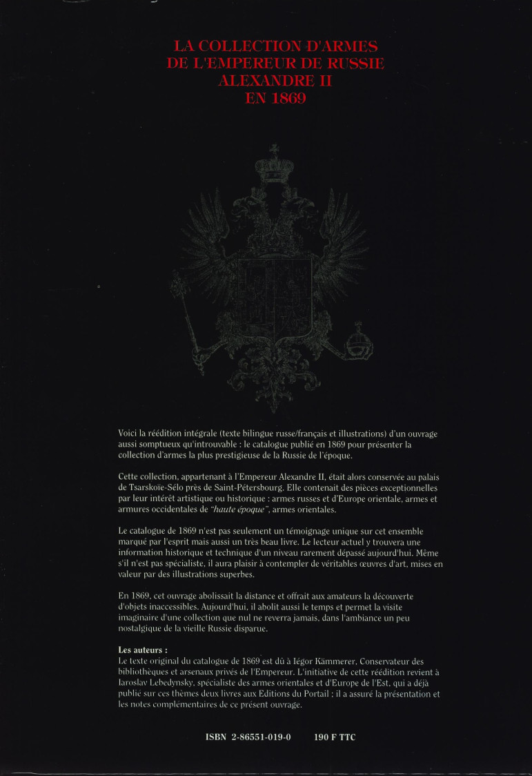 Réédition intégrale (texte bilingue russe/français et illustrations) d'un ouvrage aussi somptueux qu'introuvable : le catalogue publié en 1869 pour présenter la collection d'armes la plus prestigieuse de la Russie de l'époque.