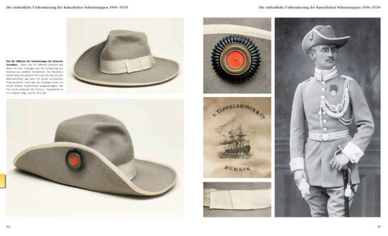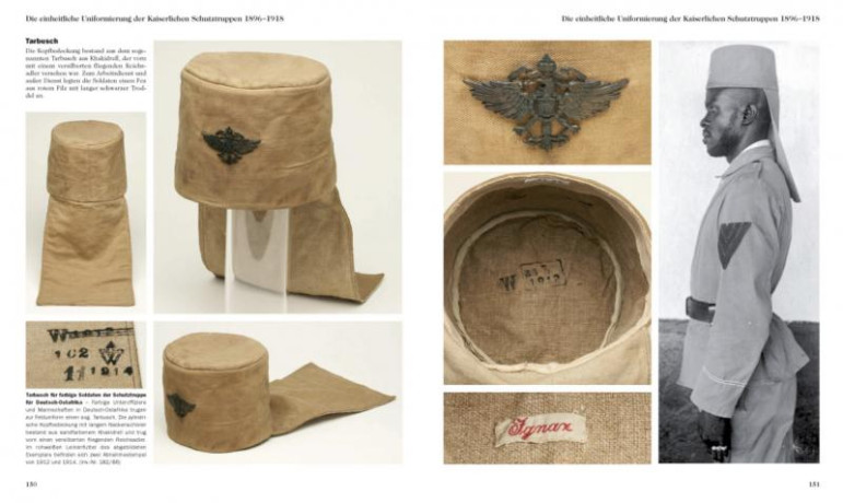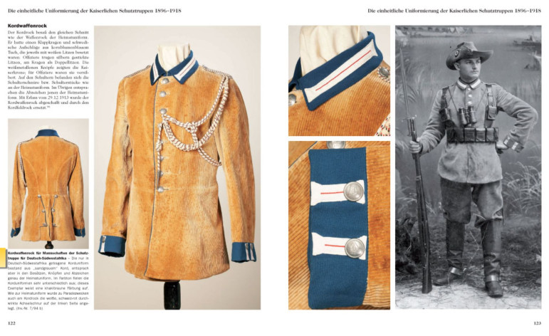La deuxième partie traite de l'habillement et de l'équipement des forces de protection. S'appuyant sur les débuts des troupes de protection en Afrique de l'Est et du Sud-Ouest allemandes depuis 1889, des uniformes pour toutes les «troupes de protection impériales» ont été créés en 1896. En plus d'un uniforme gris représentatif, il comprenait un uniforme tropical fonctionnel de couleur sable ou blanc qui était adapté au climat des zones protégées. En 1913, la tenue Feldgrau a été introduite. Malgré la forme de base standard , il y avait certaines différences dans les vêtements et l'équipement entre les zones protégées. Les différents types de combinaisons sont traités en détail dans leurs composants individuels tels que les casques, les chapeaux, les tuniques ou les cartouchières. Une section distincte est également consacrée à l'uniforme tropical des soldats de couleur.