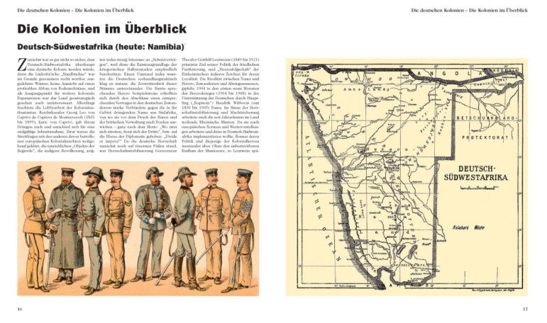 Ce remarquable ouvrage illustré d'environ 600 pages examine d'abord l'histoire des ambitions coloniales allemandes et établit ainsi un cadre historico-politique. Basée sur les premiers projets de colonisation, la première partie du livre se concentre sur les années entre 1884 (création constitutionnelle de la première «aire protégée») et 1919, fin formelle de l'empire colonial allemand suite au traité de Versailles. Il décrit les motivations des Allemands qui luttent «pour une place au soleil», la réticence du chancelier Bismarck aux colonies afin de traiter ensuite largement avec l'organisation de sécurité dans les aires protégées ainsi qu'avec le «cas spécial» colonial de Kiautschou. Les campagnes et opérations militaires d'avant-guerre et les événements de guerre entre 1914 et 1918 concluent cette partie.