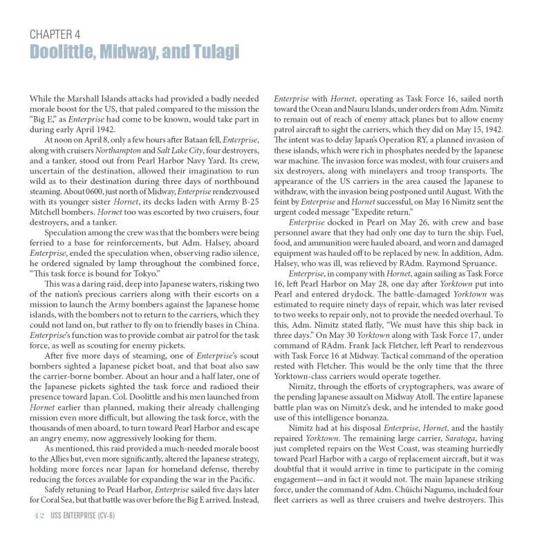 Bien qu'il ait à peine manqué d'être détruit à Pearl Harbor le 7 décembre 1941, le porte-avions USS Enterprise (CV-6) de l'US Navy a pris part à toutes les grandes actions de la guerre du Pacifique, du raid de Doolittle aux batailles de Midway, Santa Cruz et Guadalcanal jusqu'à la mer des Philippines et Leyte.