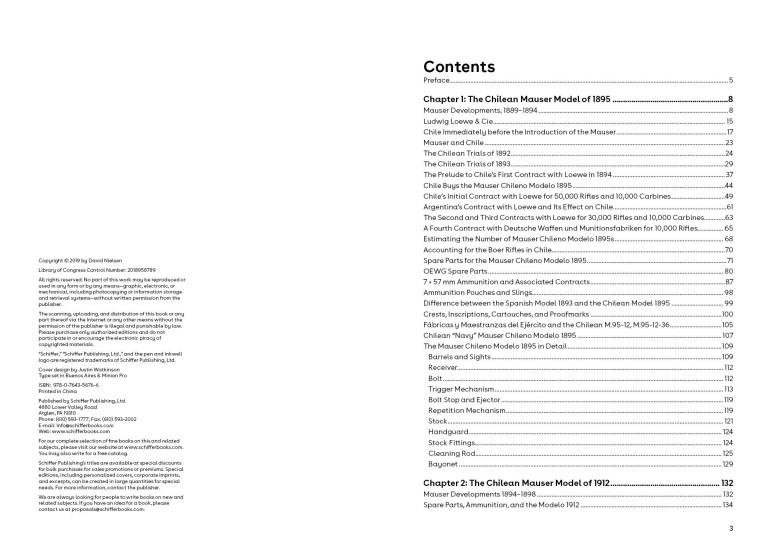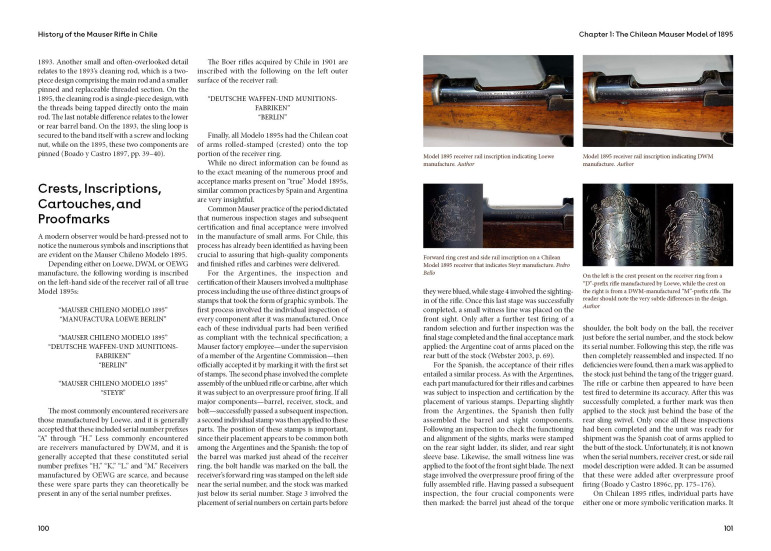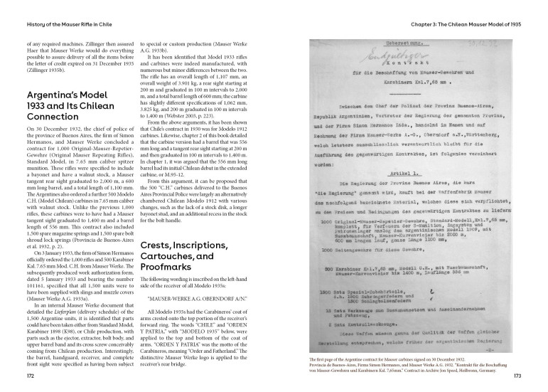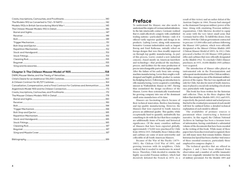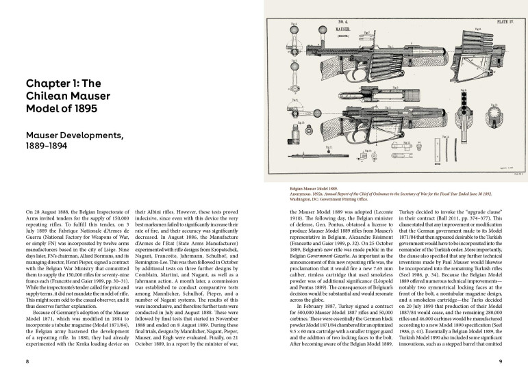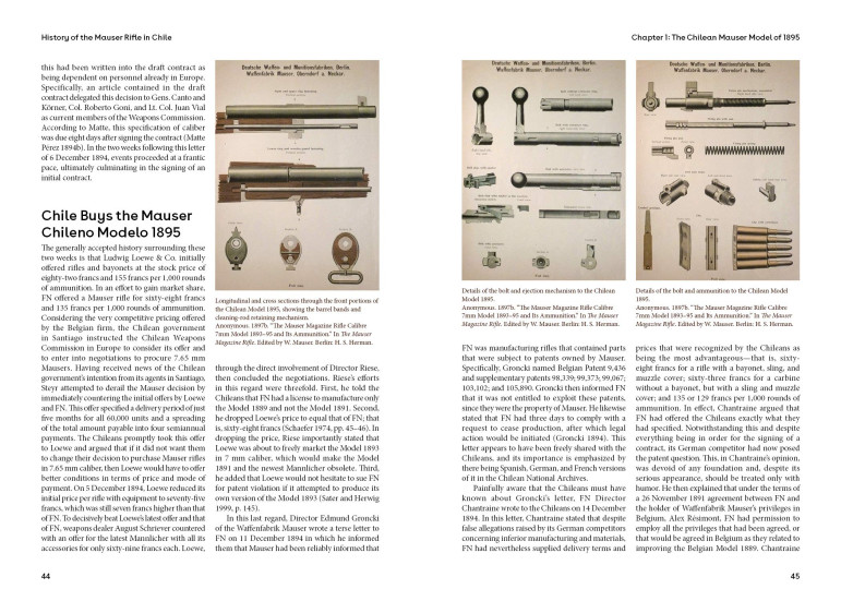 Ce livre résume les événements régionaux importants, tout en offrant également un aperçu historique général des développements de Mauser. Il expose ensuite les détails des Mausers chiliens, les achats qui ont abouti aux modèles 1895, 1912 et 1935. Les spécificités techniques de chacun de ces trois modèles et les événements historiques entourant leur acquisition sont également détaillés. Le résultat est la première tentative complète de documentation de ces artefacts et événements importants, qui, on l'espère, amorcera d'autres recherches sur ce sujet fascinant.