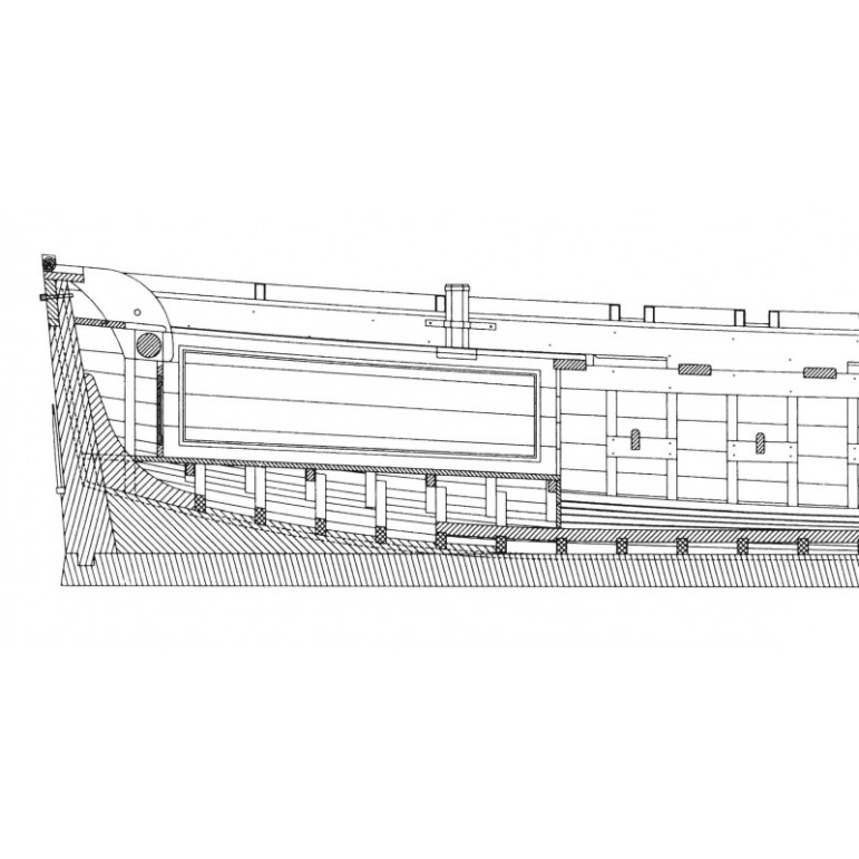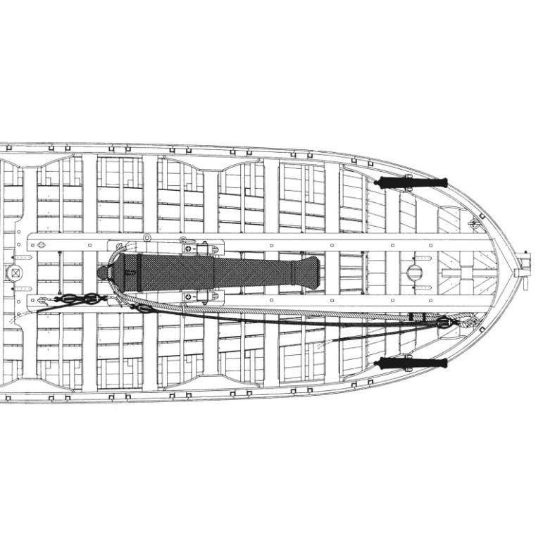 La monographie de La chaloupe armée en guerre ne propose pas le dessin de son gréement car celui-ci est déposé lorsque la chaloupe est dans cette configuration.