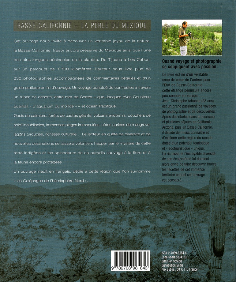 Cet ouvrage nous invite à découvrir un véritable joyau de la nature, la Basse-Californie, trésor encore préservé du Mexique ainsi que l'une des plus longues péninsules de la planète. De Tijuana à Los Cabos, sur un parcours de 1 700 kilomètres, l'auteur nous livre plus de 230 photographies accompagnées de commentaires détaillés et d'un guide pratique en fin d'ouvrage. Un voyage ponctué de contrastes à travers un ruban de déserts, entre mer de Cortés - que Jacques-Yves Cousteau qualifiait " d'aquarium du monde " - et océan Pacifique. Oasis de palmiers, forets de cactus géants, volcans endormis, couchers de soleil inoubliables. immenses plages Immaculées. côtes ourlées de mangrove, lagons turquoise, richesse culturelle...