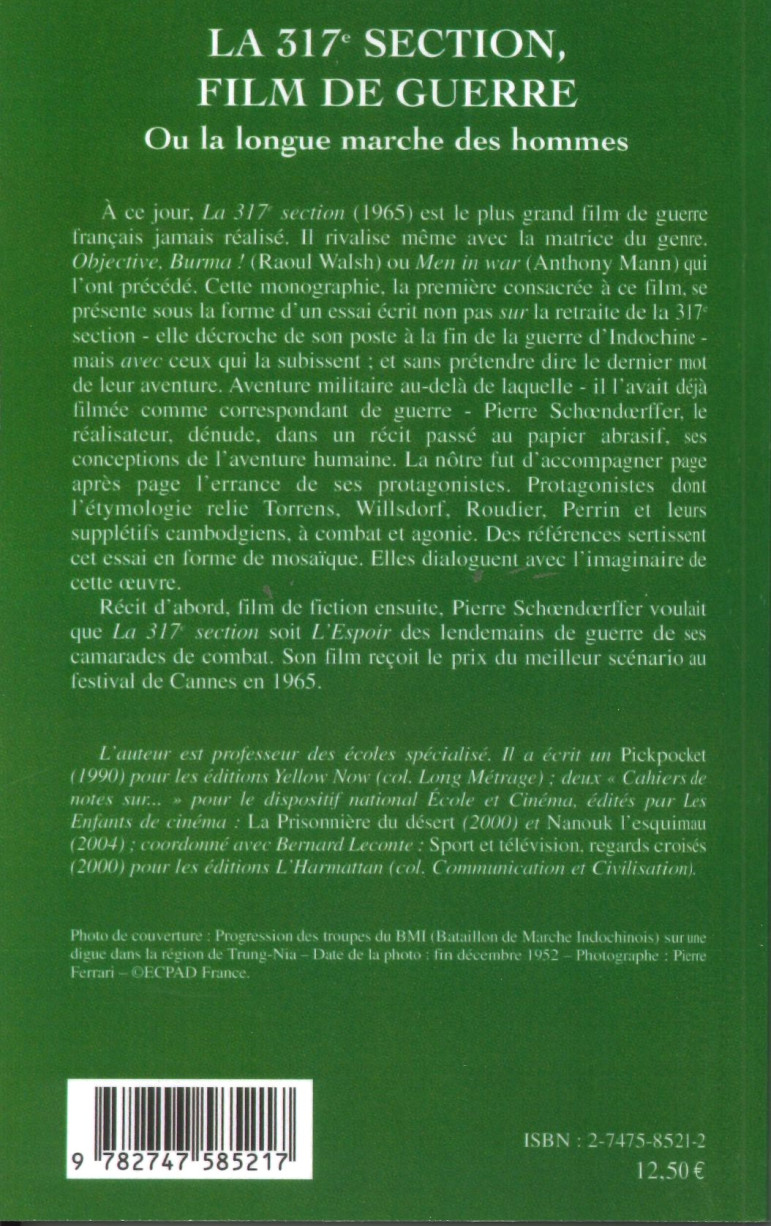 A ce jour, La 317è section (1965) est le plus grand film de guerre français jamais réalisé. Cette monographie, la première consacrée à ce film, se présente sous la forme d'un essai écrit non pas sur la retraite de la 317è section mais avec ceux qui la subissent. Aventure militaire de la guerre d'Indochine au-delà de laquelle Pierre Schoendoerffer, le réalisateur, dénude ses conceptions de l'aventure humaine. L'auteur accompagne page après page l'errance de ses protagonistes.