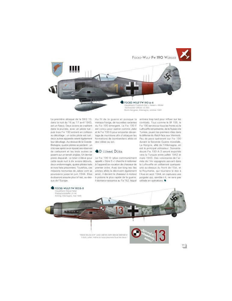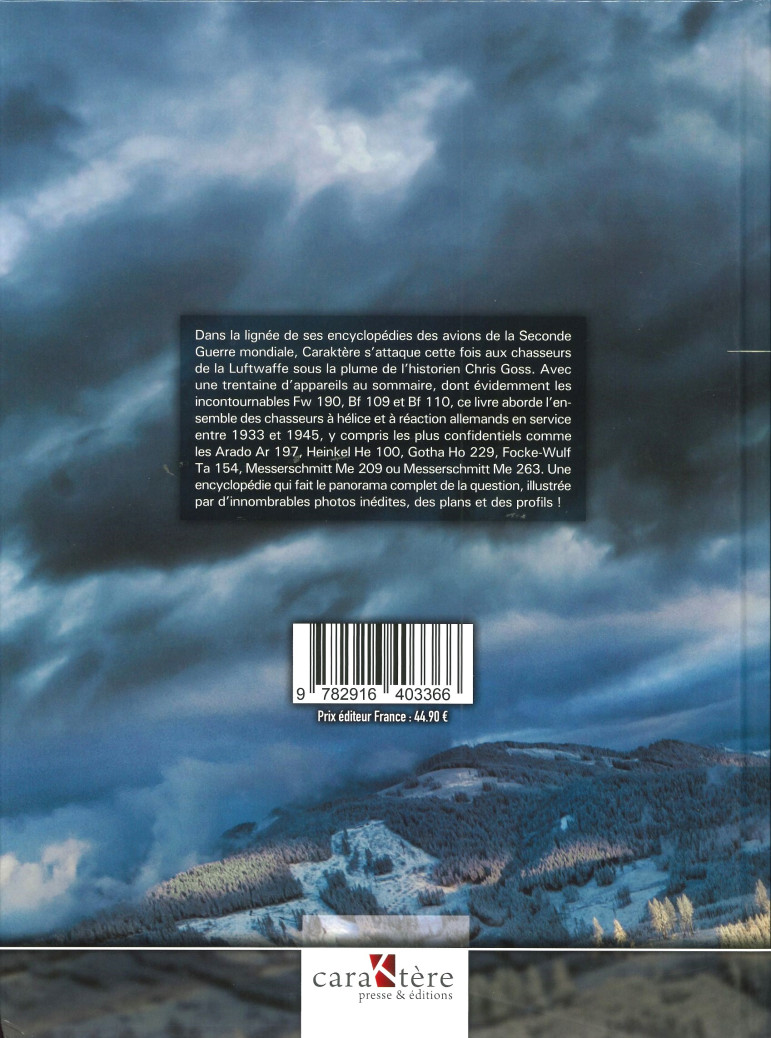 Dans la série de ses encyclopédies des avions de la Seconde Guerre mondiale, Caraktère s’attaque cette fois aux chasseurs de la Luftwaffe sous la plume de l’historien Chris Goss. Avec une trentaine d’appareils au sommaire, dont évidemment les incontournables Fw 190, Bf 109 et Bf 110, ce livre aborde l’ensemble des chasseurs à hélice et à réaction allemands en service entre 1933 et 1945, y compris les plus confidentiels comme les Arado Ar 197, Heinkel He 100, Gotha Ho 229...