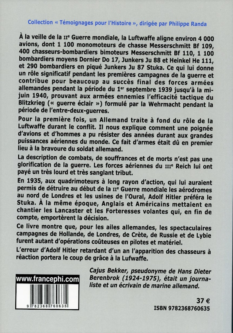 Ce livre montre que, pour les ailes allemandes, les spectaculaires campagnes de Hollande, de Londres, de Crète, de Russie et de Libye furent autant d’opérations coûteuses en pilotes et matériel.