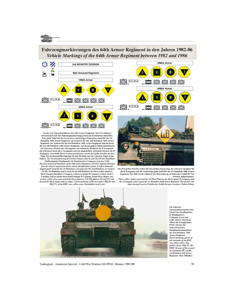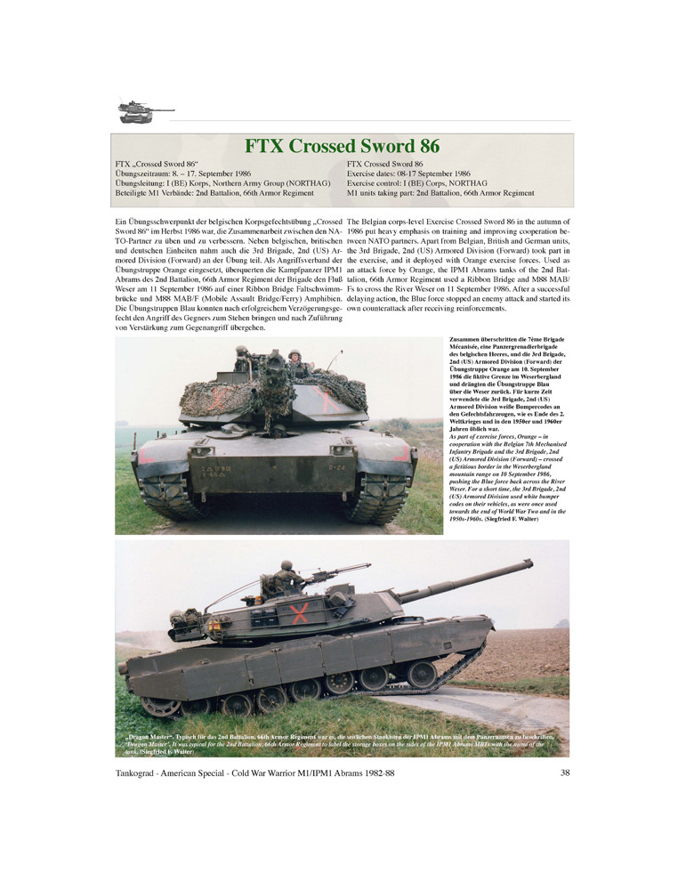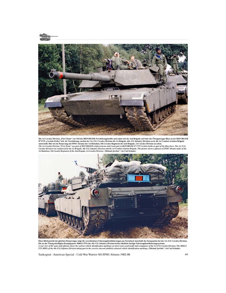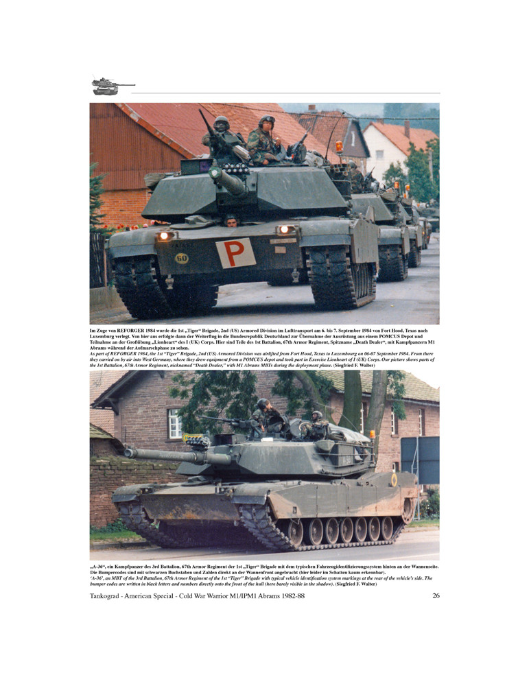 Cette publication montre l'introduction et les premières années de service des chars de combat principaux M1 et IPM1 dans des photos d'exercice prises avec l'USAREUR en Allemagne 1982-88. En outre, il y a des rapports sur des expériences personnelles, des informations générales sur les exercices impliquant le nouveau MBT, des informations sur le camouflage, y compris des schémas de camouflage spéciaux et des codes de pare-chocs et un chapitre spécial sur les marquages des unités américaines équipées de M1.