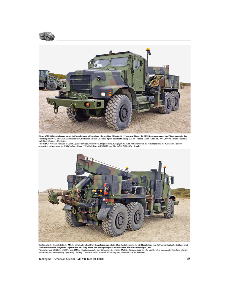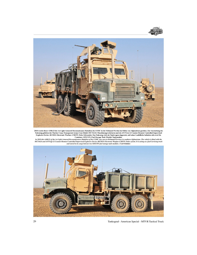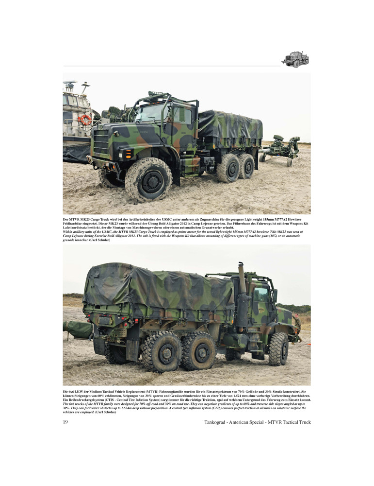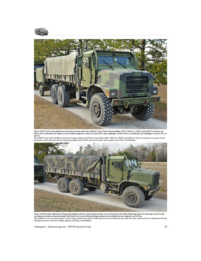 Parmi les nombreuses variantes décrites dans cette publication figurent, par exemple, le camion cargo MK23, le plateau allongé MK27 (XL), le camion à benne basculante MK29, le tracteur MK31 et la dépanneuse MK36. Sont également décrites les différentes phases de blindages complémentaires telles que le kit de protection blindé (APK) et le système blindé MTVR (MAS).