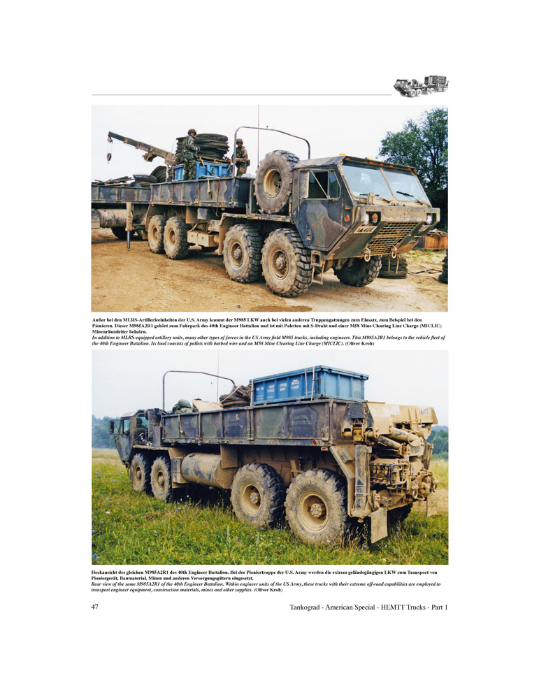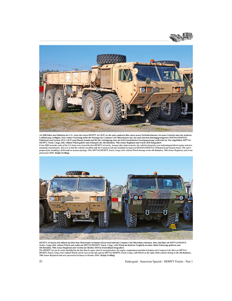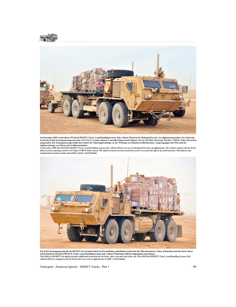 Cette publication est l'ouvrage standard amélioré sur le HEMTT. Il couvre les types de base M977, M978, M983, M984, M985, M1120 et M1977 ainsi que leurs variantes jusqu'aux versions A4. S'étendant sur deux volumes de 128 pages et avec pas moins de 265 photographies en couleurs, dont beaucoup jusqu'alors inédites, il remplace l'édition originale longue épuisée Tankograd American Special 3003.